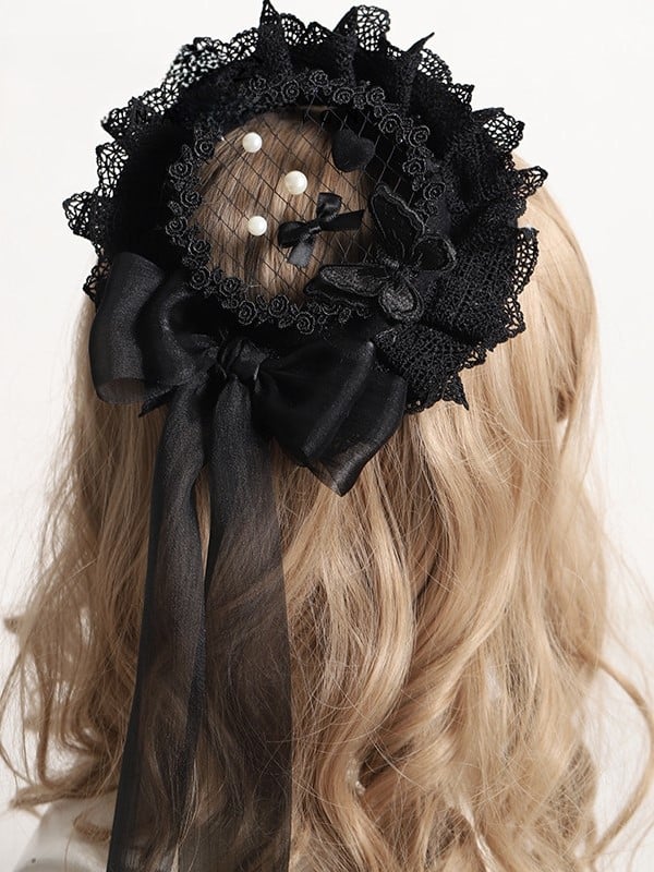 Lolita Bow Hat with Mesh Mini and Bead White/Yellow/Black Embellishments