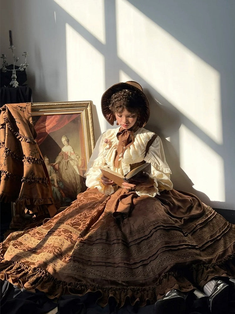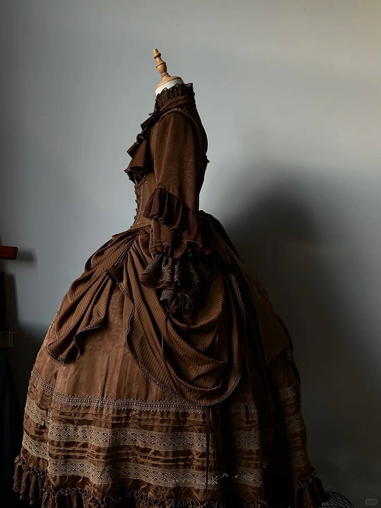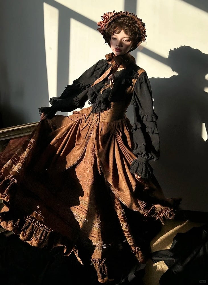 Brown Under Bust Boned Waist Gothic Lolita Dress with Embroidery Detail