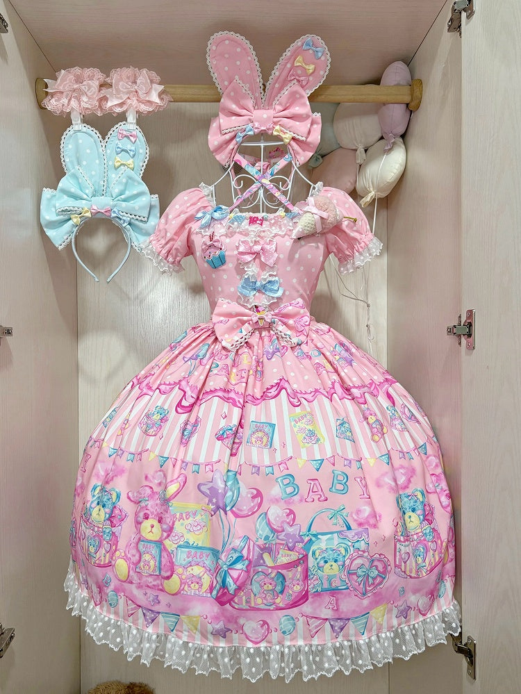 バニードールとテディベアのプリントが入ったピンクのスイートロリータショートパフスリーブドレス