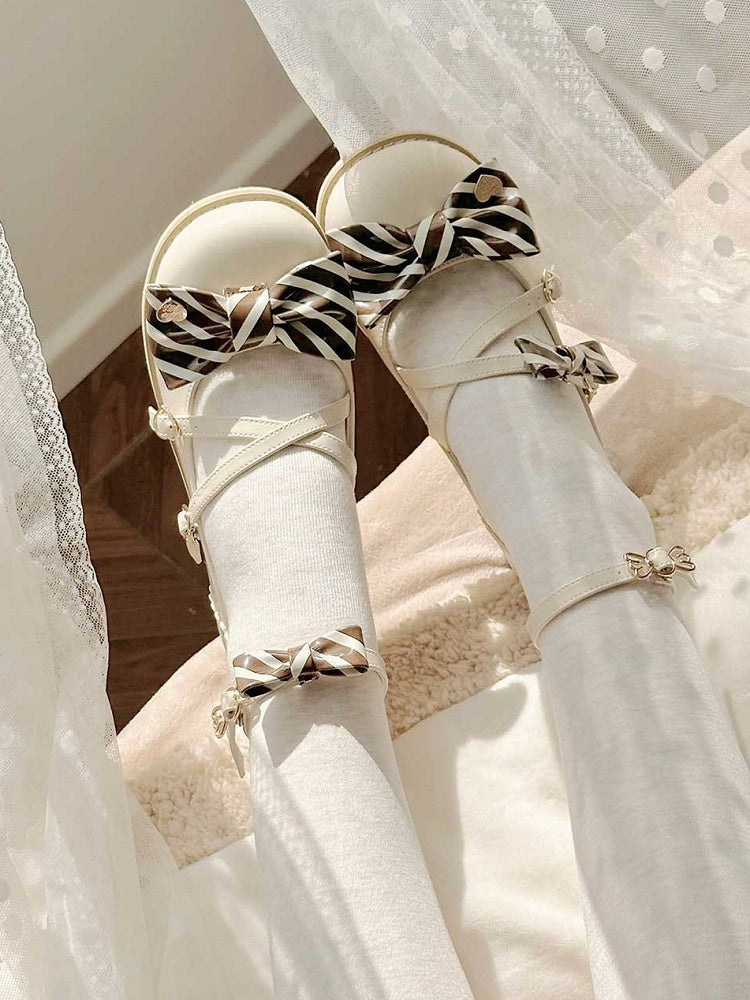 ロリータ クリスクロス ボウ ベージュブラウン バックル ストライプ シューズ デザイン トップス パターン ハート