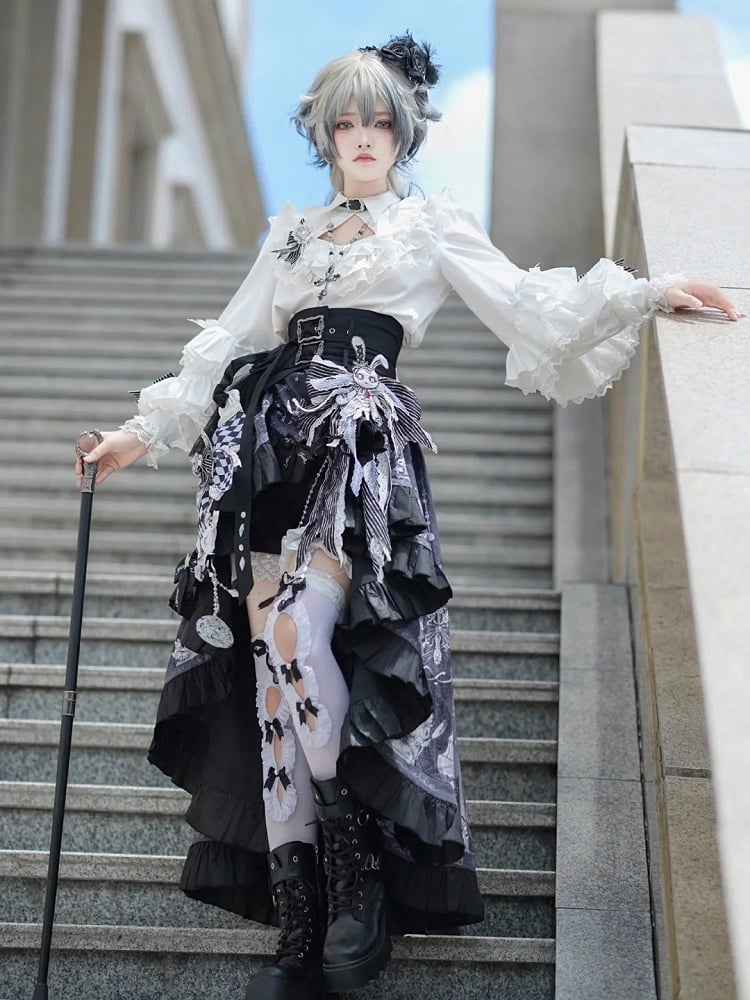 Circus Vibes Ouji Lolita Outfit - White Shirt + Black Shorts + Corset Belt + Bunny Print High-low Skirt