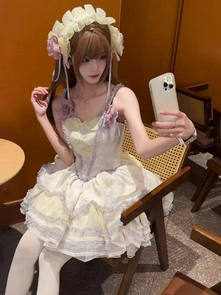 Lolita Layered Skirt Purple Floral-Print Trimmings and Princess Lace Jumper with Ruffles