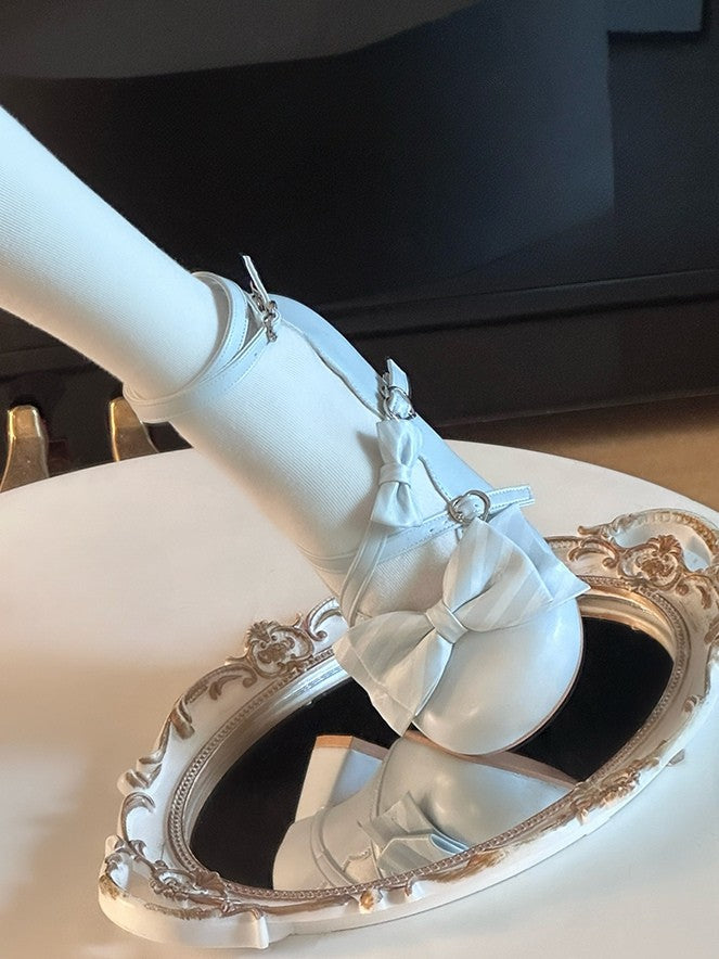 Sweet Lolita Light Blue Mary Jane Shoes - Mid Heel with Striped Bow Decor, Heart-Shaped Buckles & Crisscross Strap Design