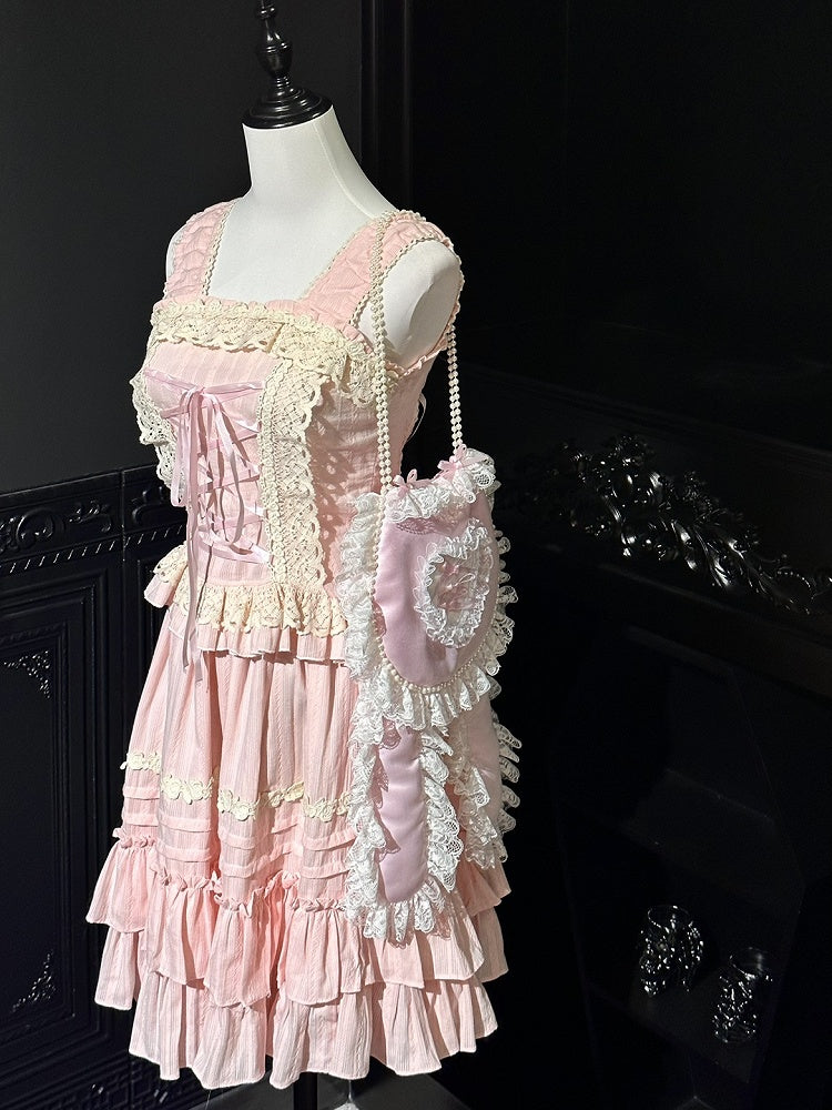 ピンクと白のオールドスクールロリータファッションドレス、蝶結びディテール、ロリータJSKセット