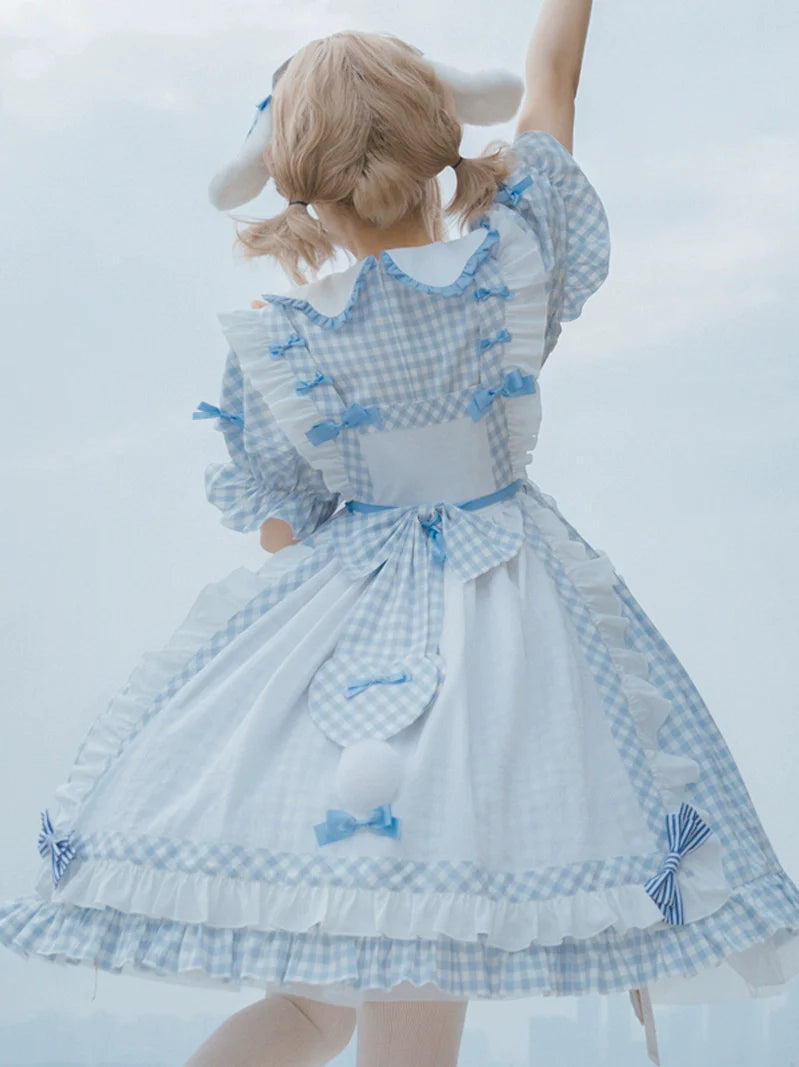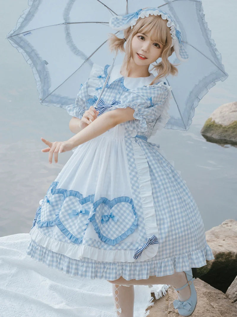 青と白のオールドスクールロリータファッションドレス 蝶結びディテール JSK セット