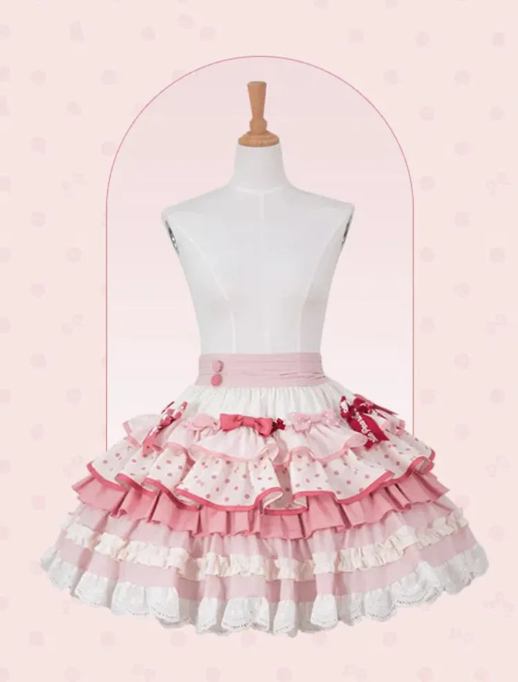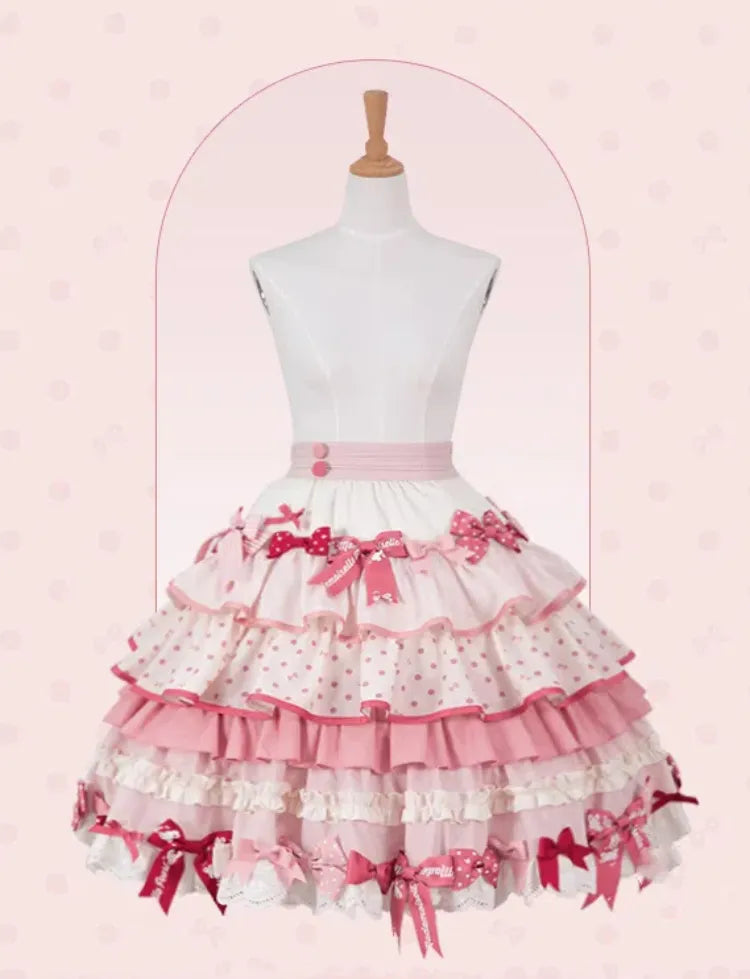 ロリータ スイート ピンク 水玉模様 ボウスカート フリル アクセント ティアード柄