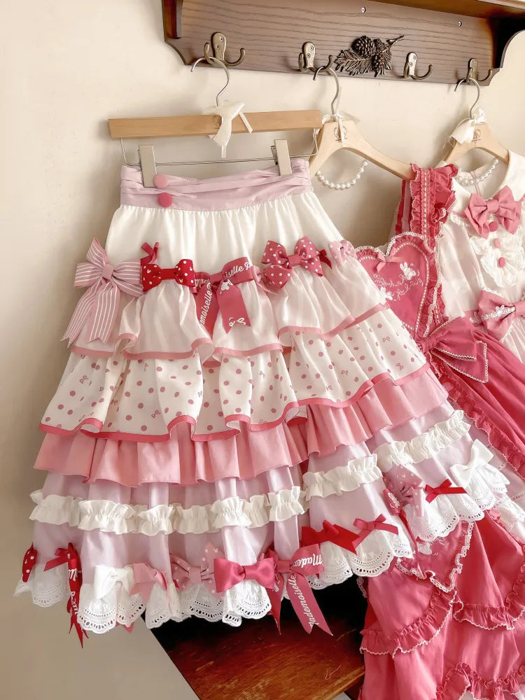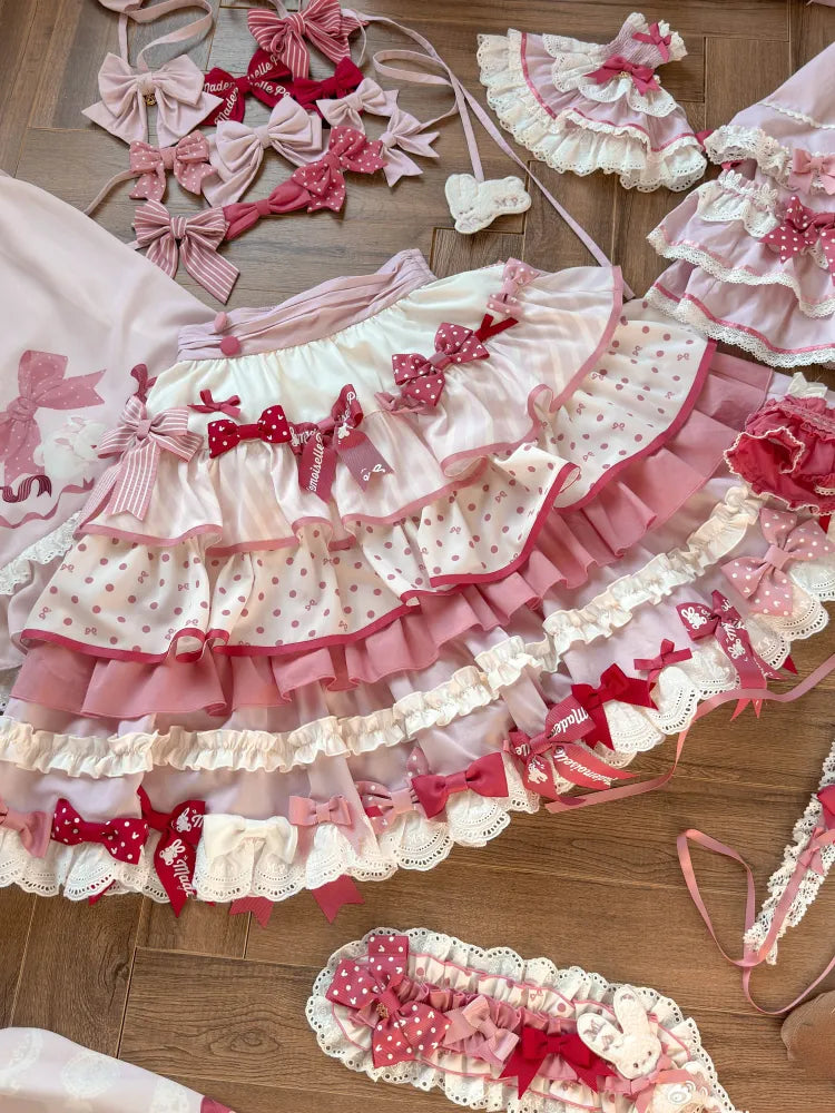 ピンクのリボンがアクセントのスイートロリータ水玉模様のティアードフリルスカート