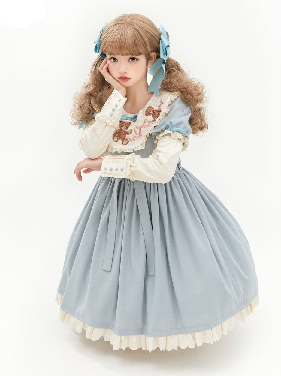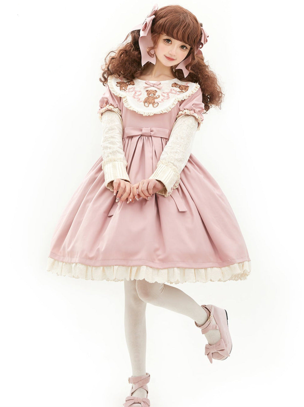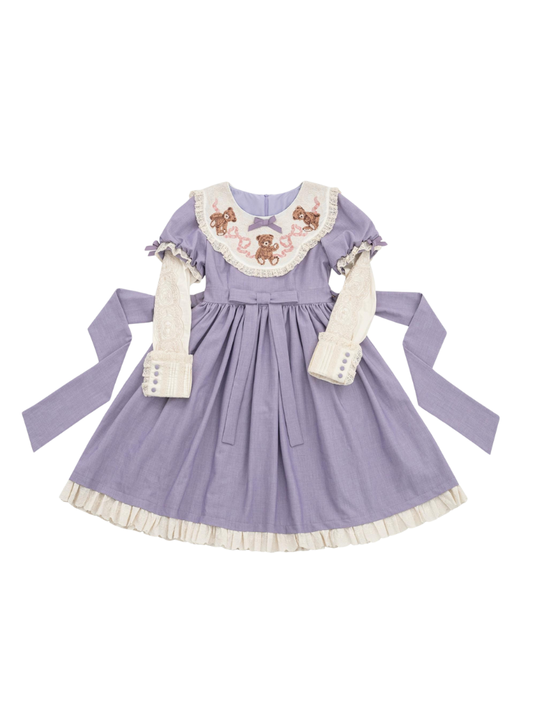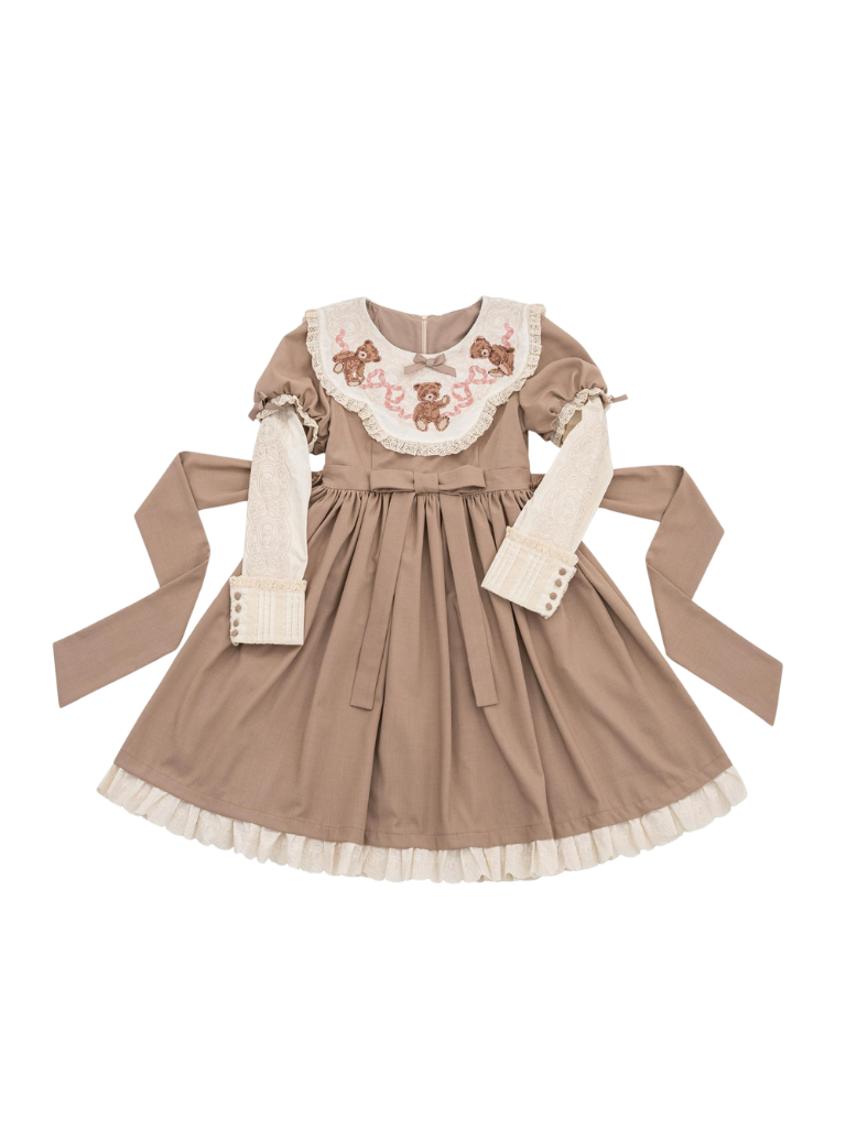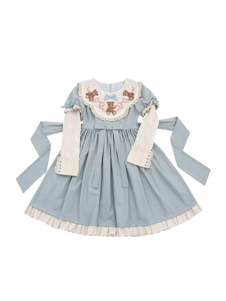 ロリータテディベアフラップレースパフスリーブリボンデレス