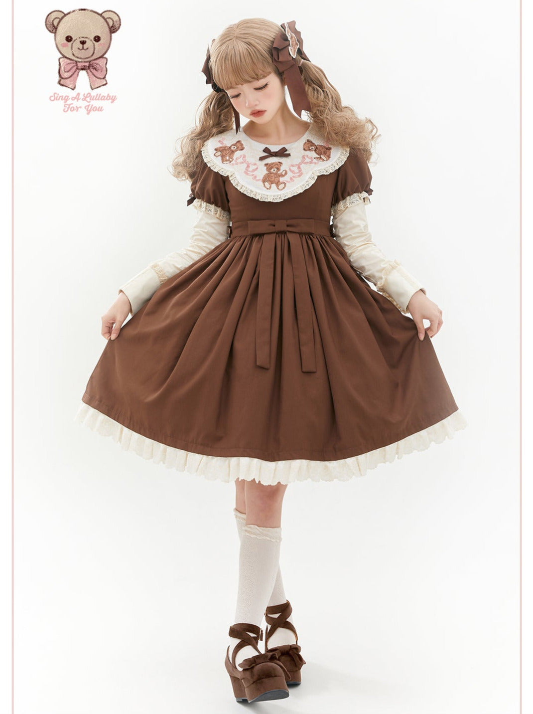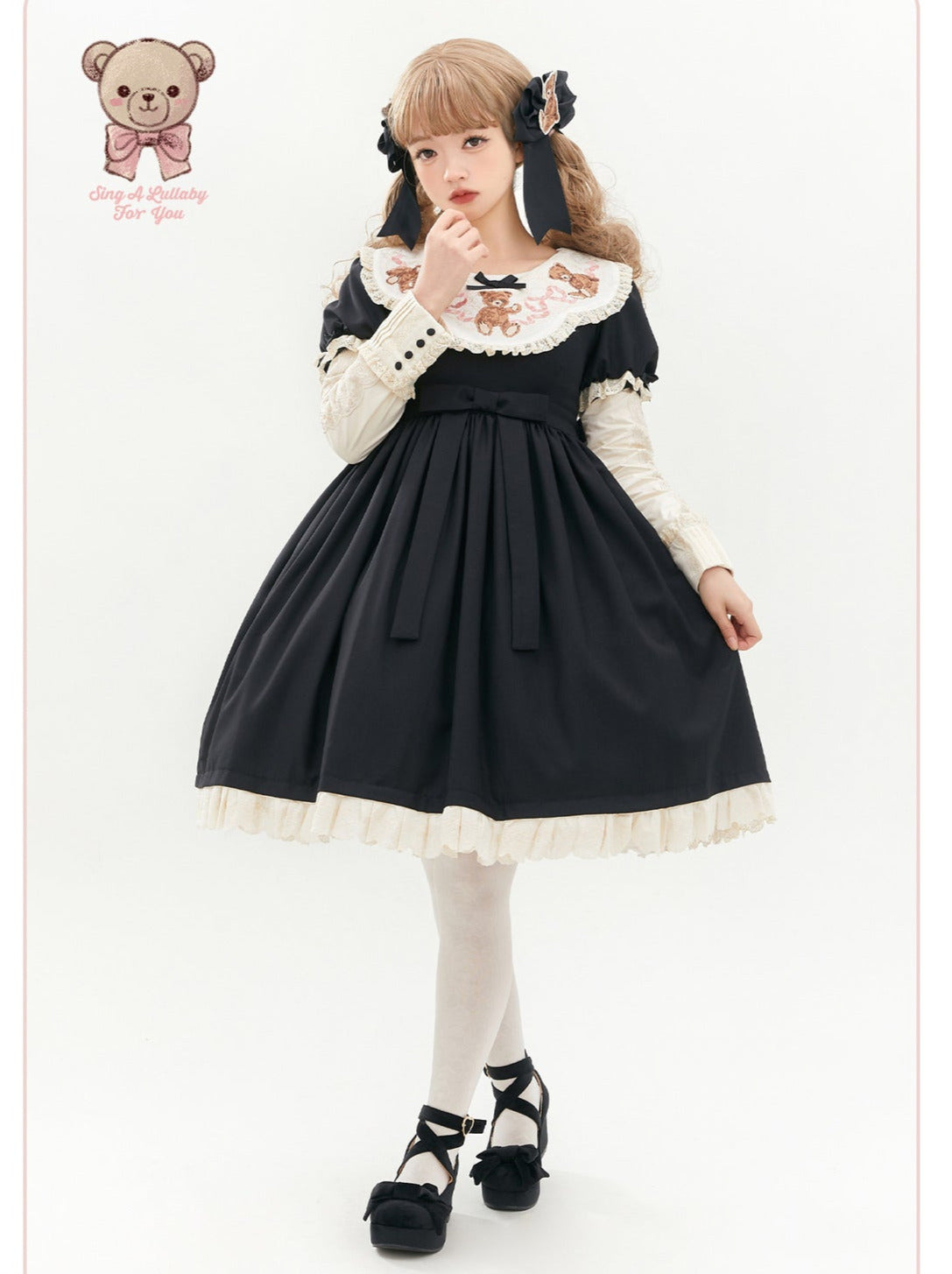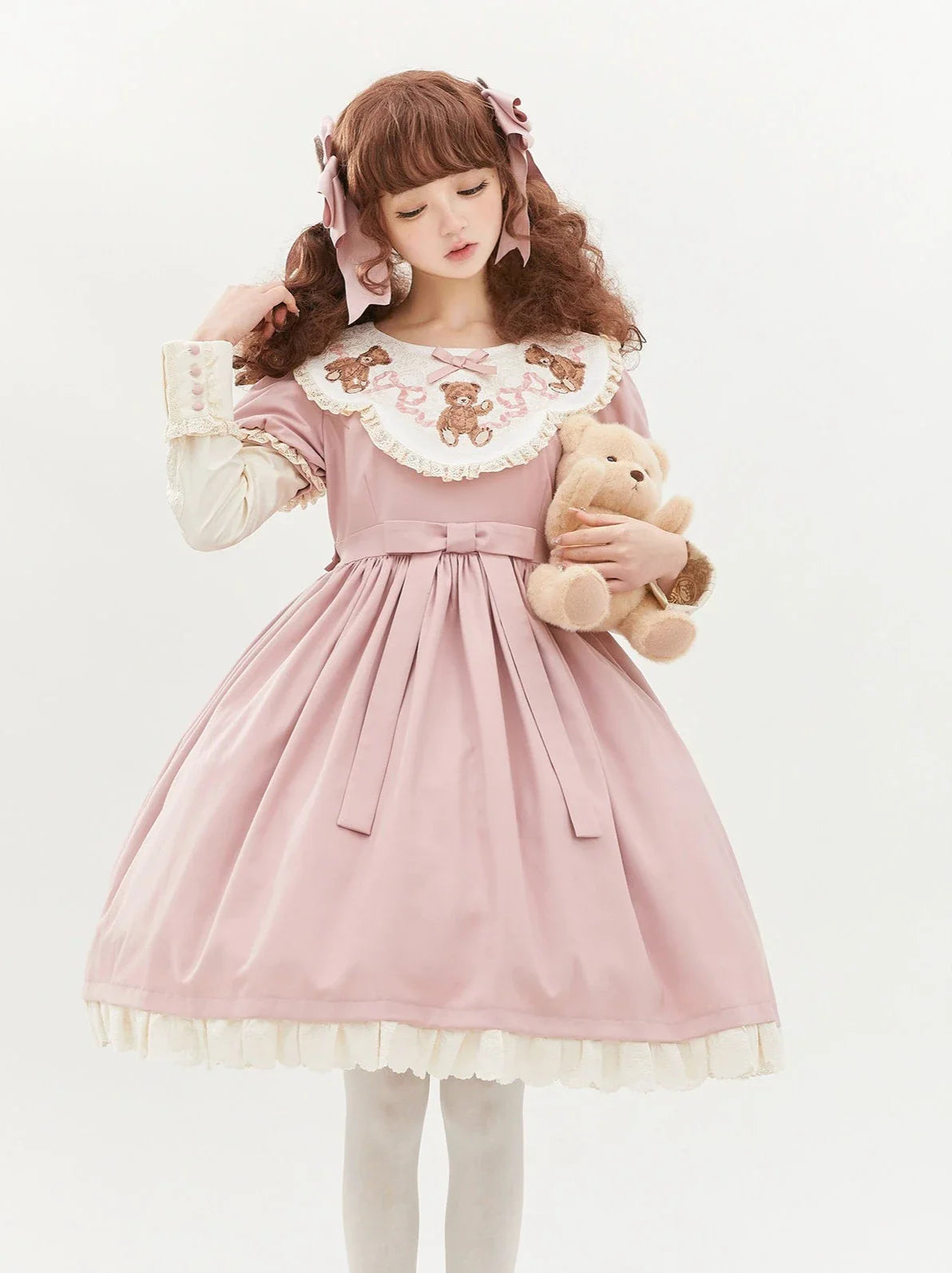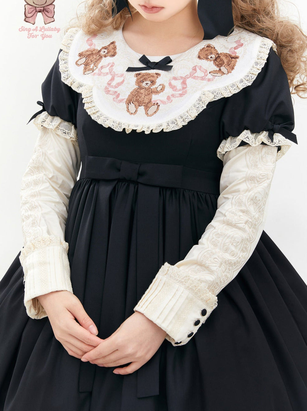 ロリータテディベアフラップレースパフスリーブリボンデレス