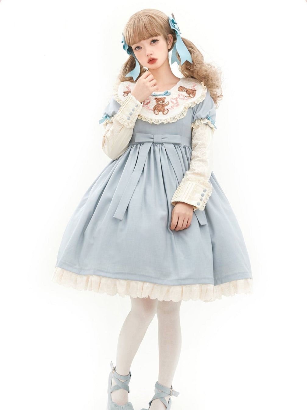 青と白のオールドスクールロリータファッションドレス 蝶結びディテール JSK セット