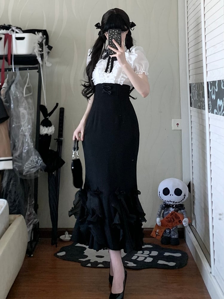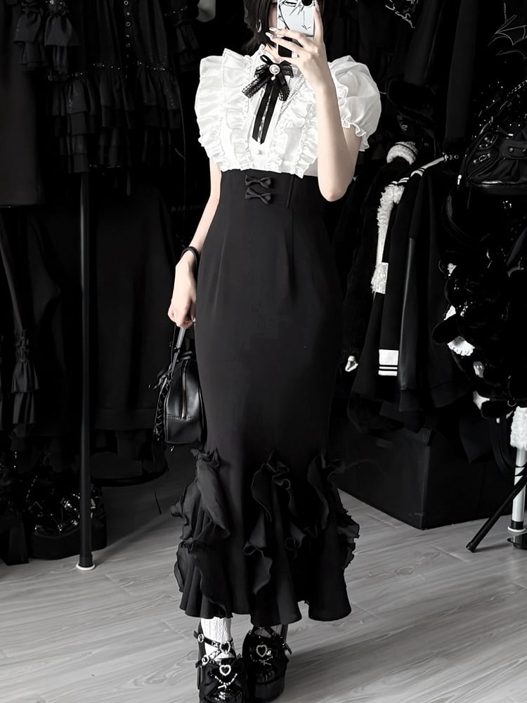 フェイクツーピースデザイン ホワイトブラウスとブラックマーメイドスカート ボーンウエスト エレガントロリータドレス