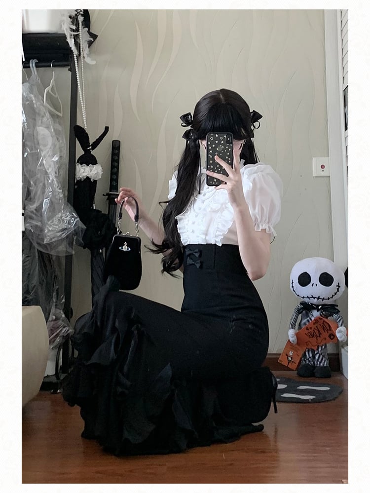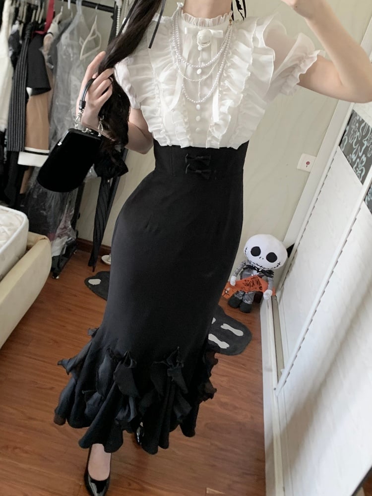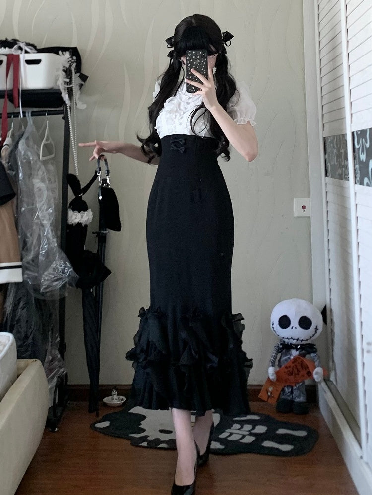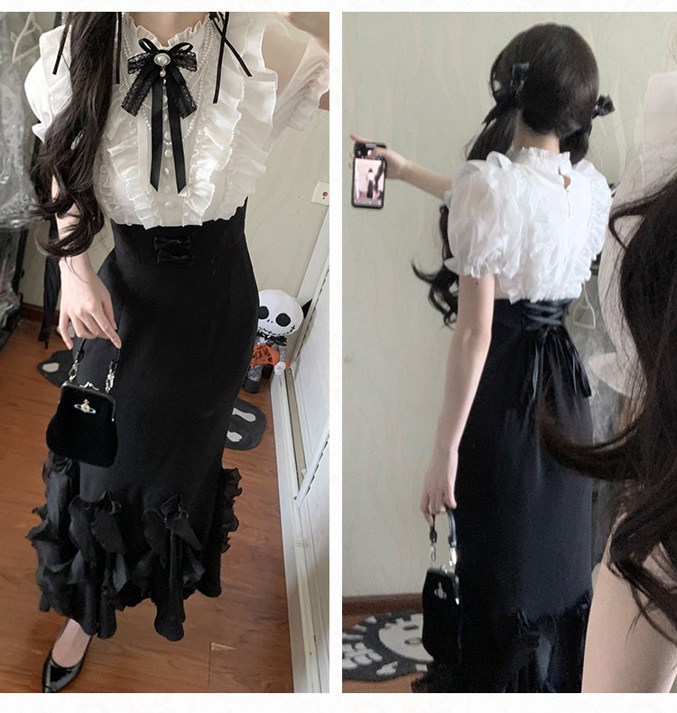 ロリータホワイトピースブラックエレガントツーデザインマーメイドドレスウエストスカートボーンフェイクブラウス