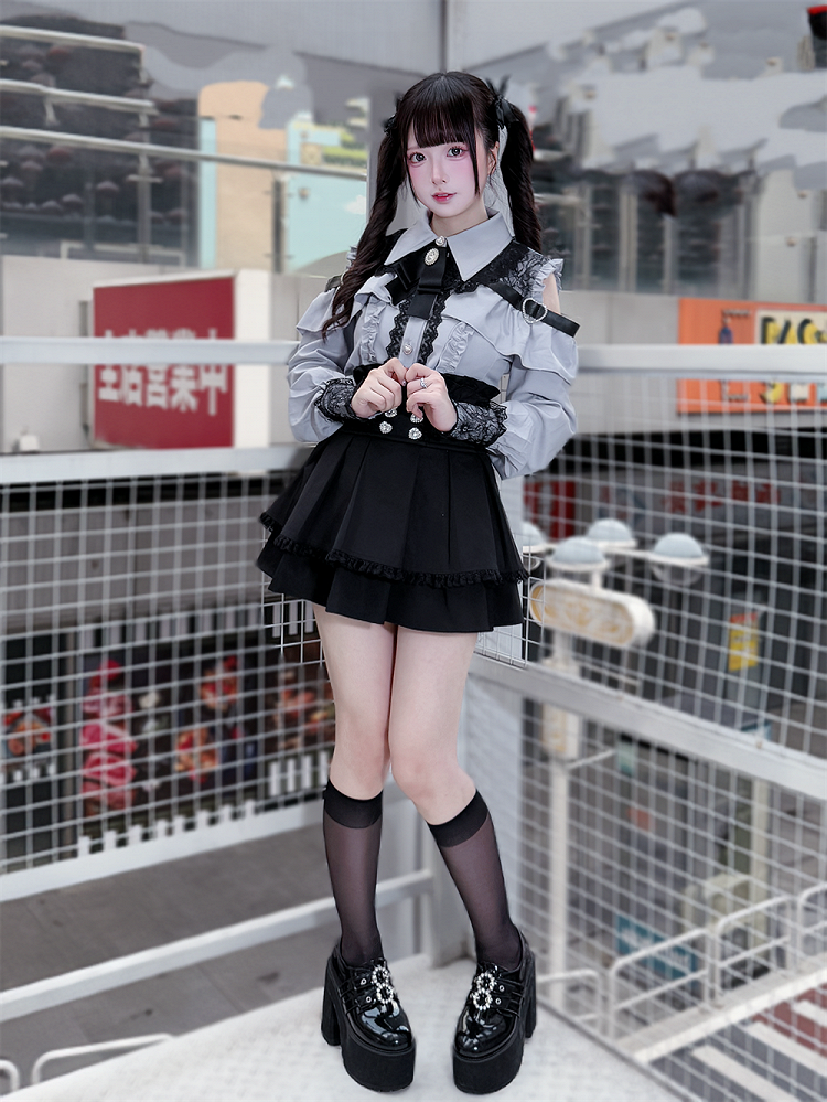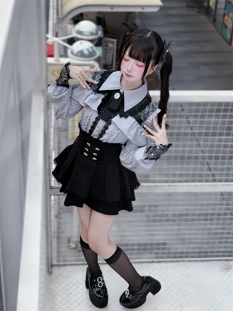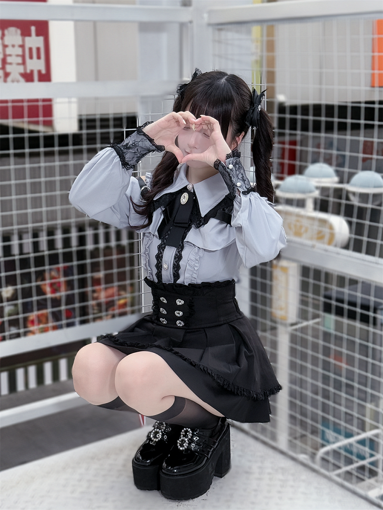 Jirai Kei Dusty Blue Long Sleeves Blouse - Sweetheart Buttons, Cutout Shoulders & Free Bow Tie