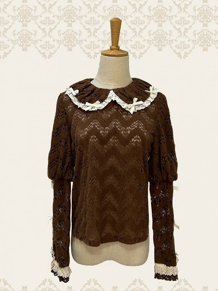 コーヒー色のピーターパンカラーの長袖ニットトップス