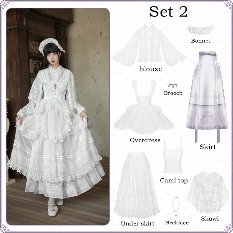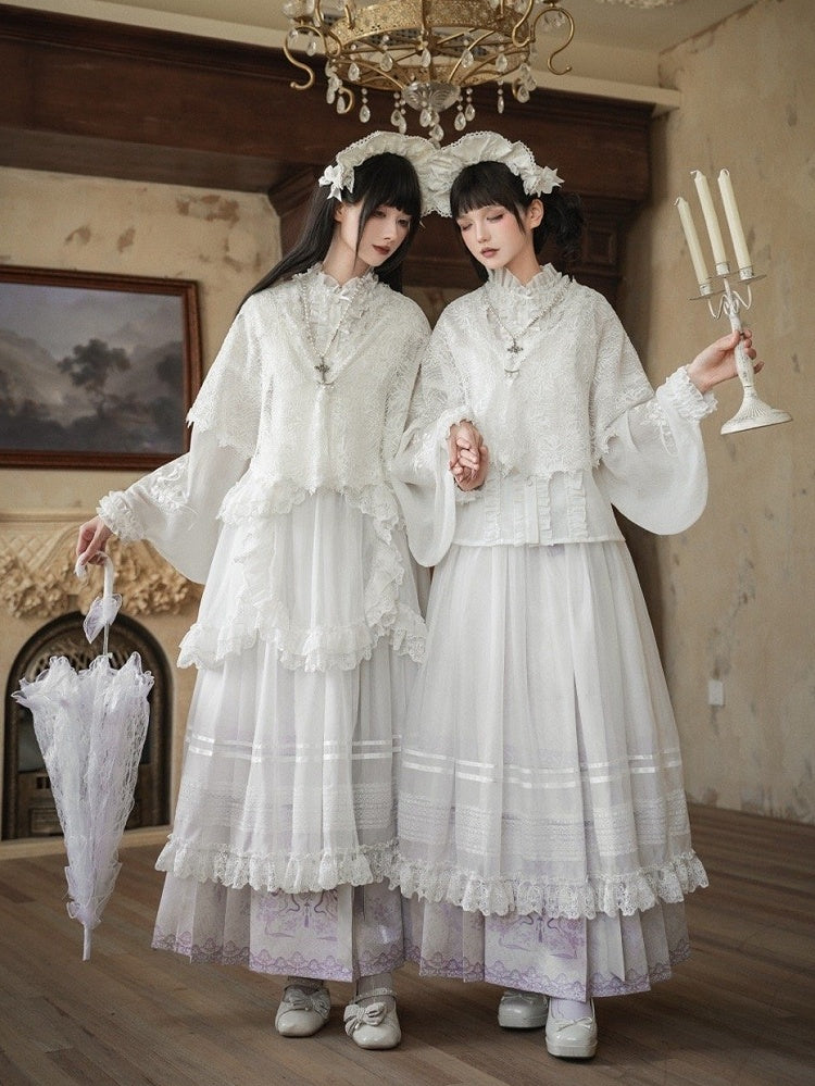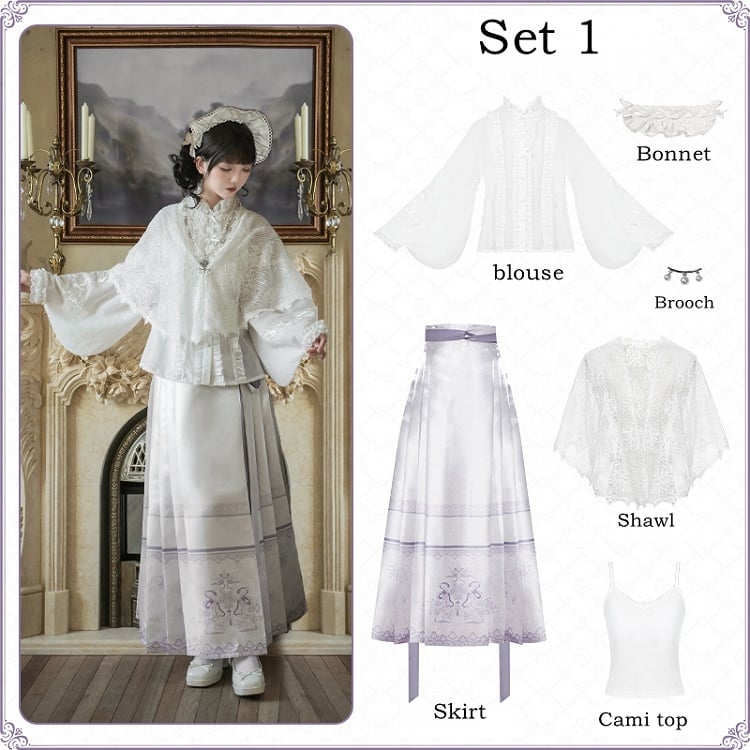 ロングスカート 花柄袖 パープル + ロリータプリント 漢馬顔とライトブラウス ホワイトセット フルスネーク