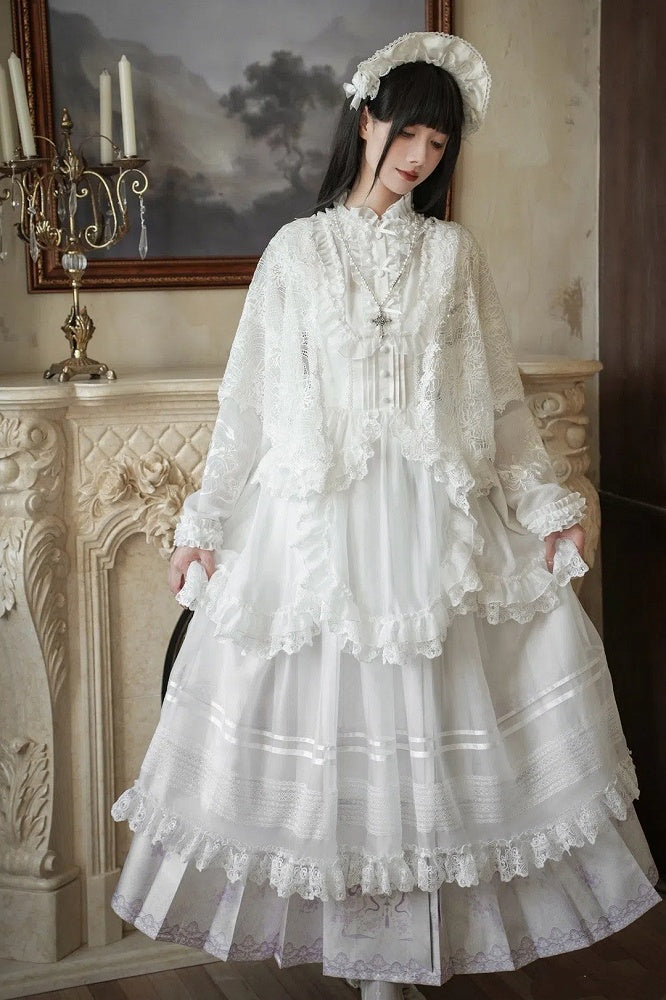 白い長袖ブラウス+薄紫の花柄と蛇柄の馬顔スカートの漢ロリータフルセット