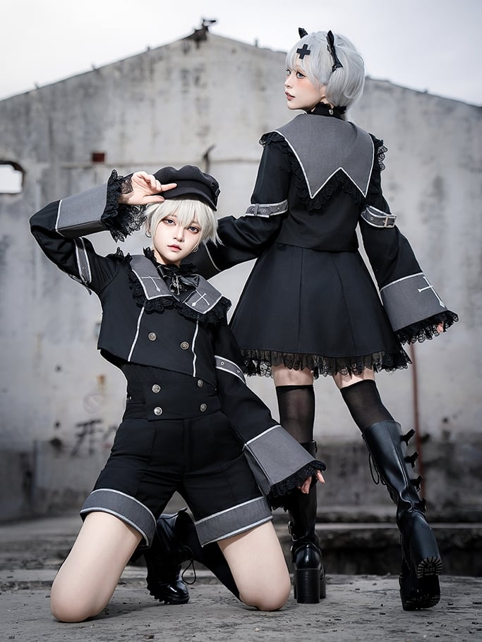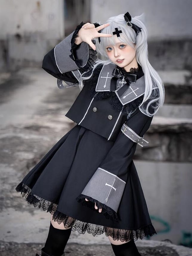 クロス刺繍スクエアカラー王子ロリータ長袖クロップドトップスブラック&グレー