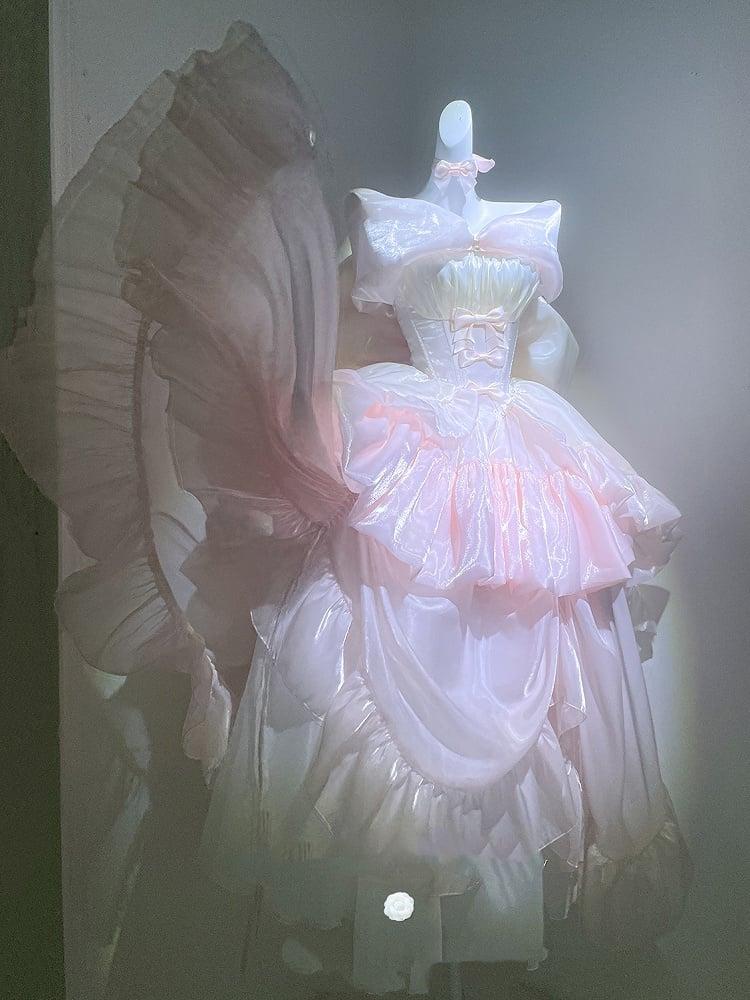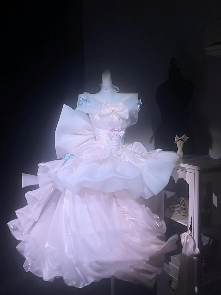ピンクと白のオールドスクールロリータファッションドレス、蝶結びディテール、ロリータJSKセット