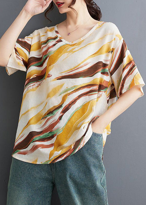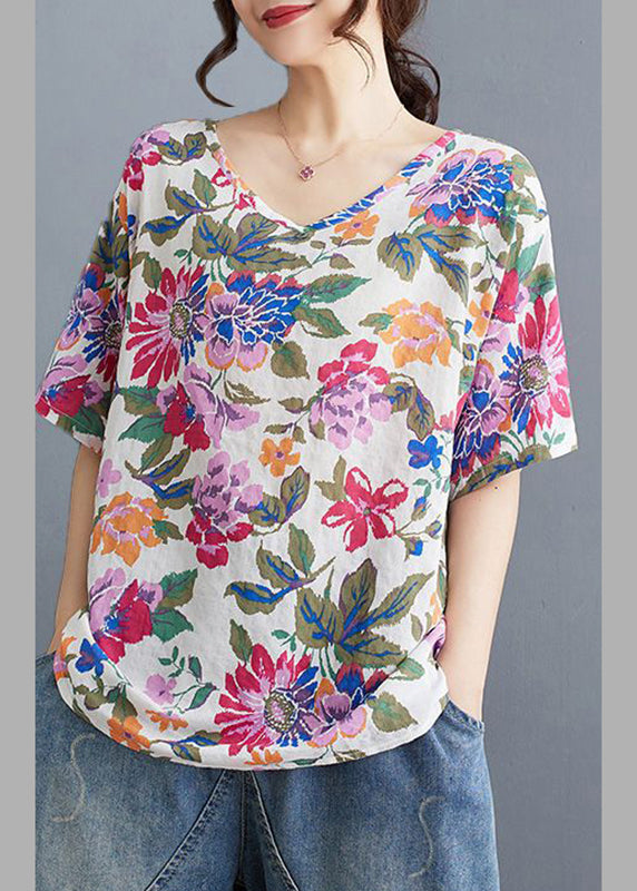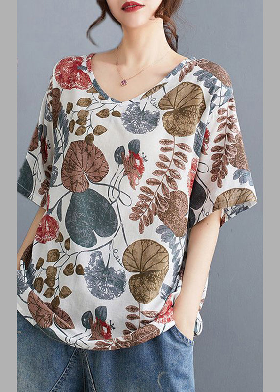 ゆったりとした赤いVネックプリントTシャツ 夏