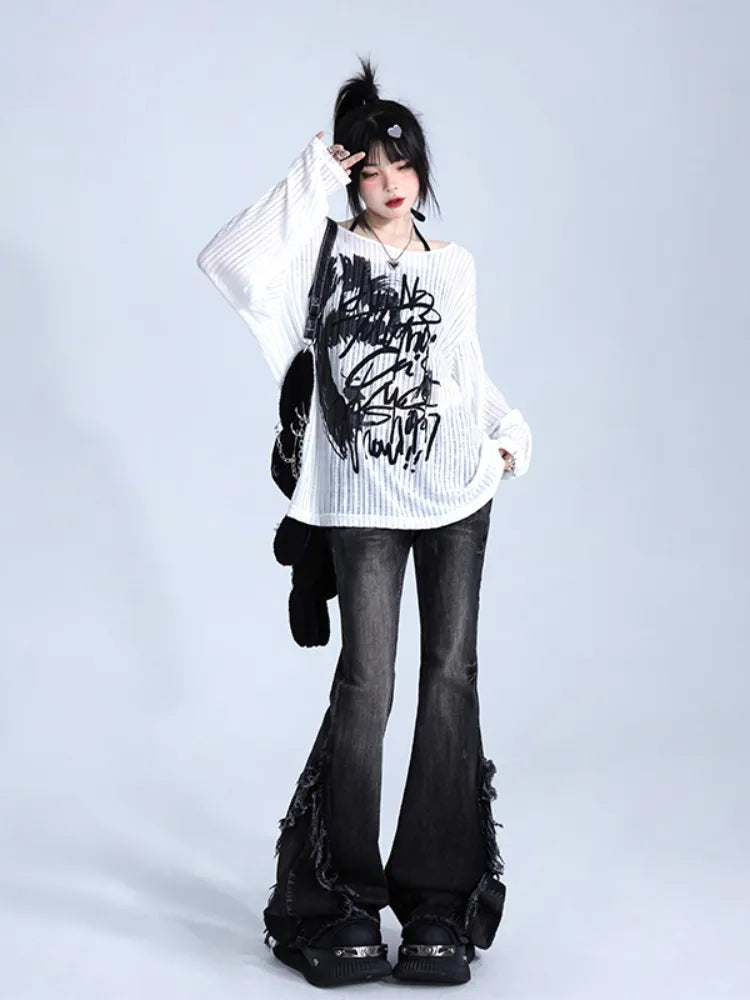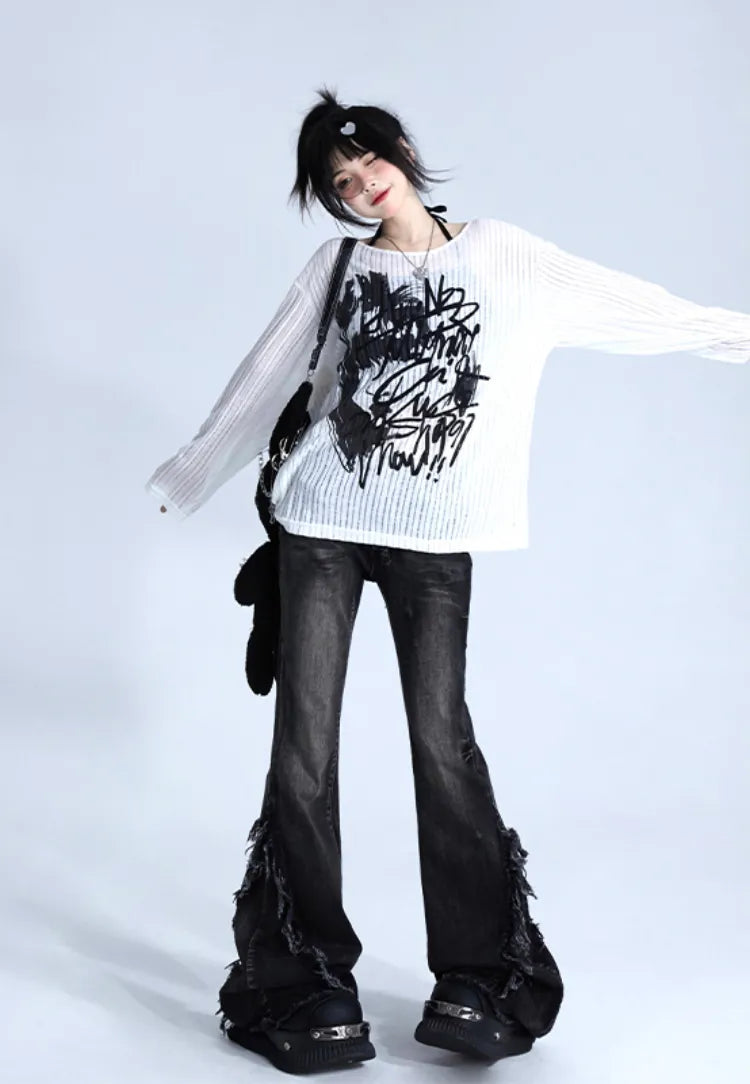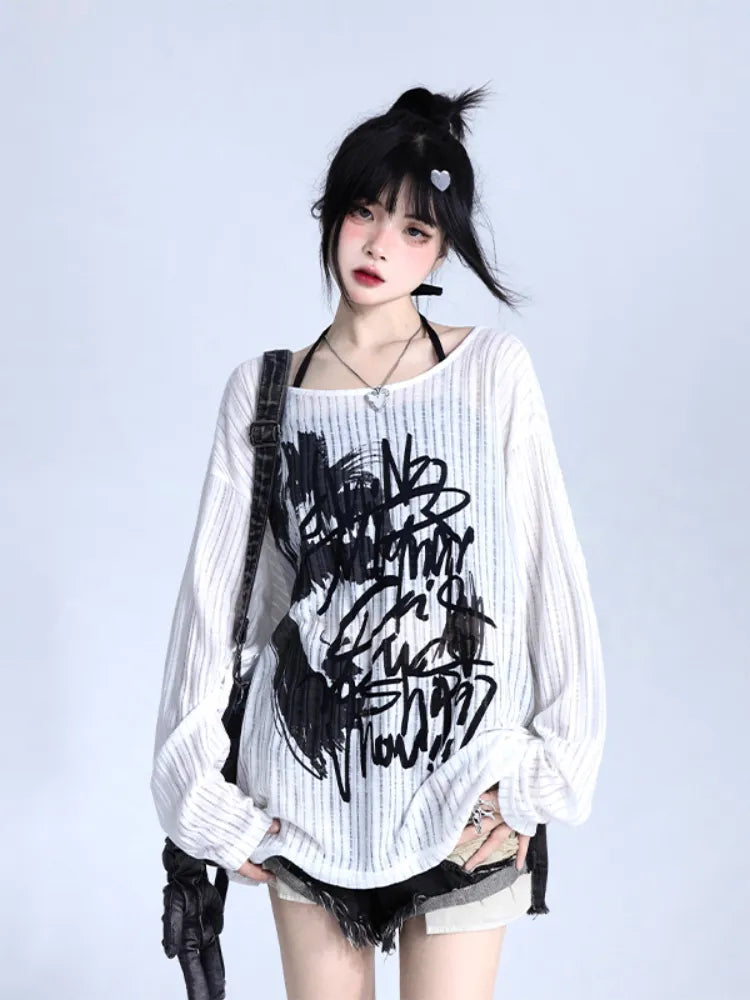 グラフィティプリント ホワイト ルーズフィット ニット プルオーバー