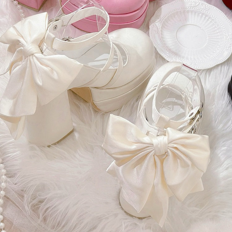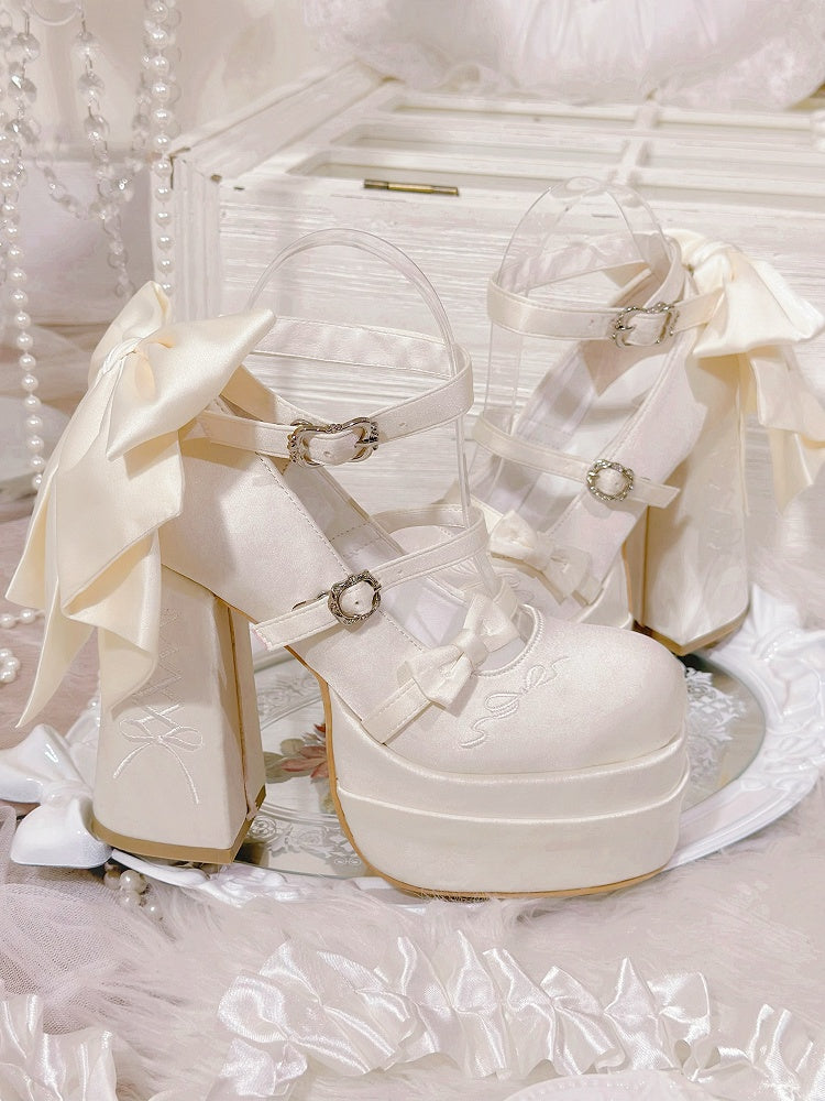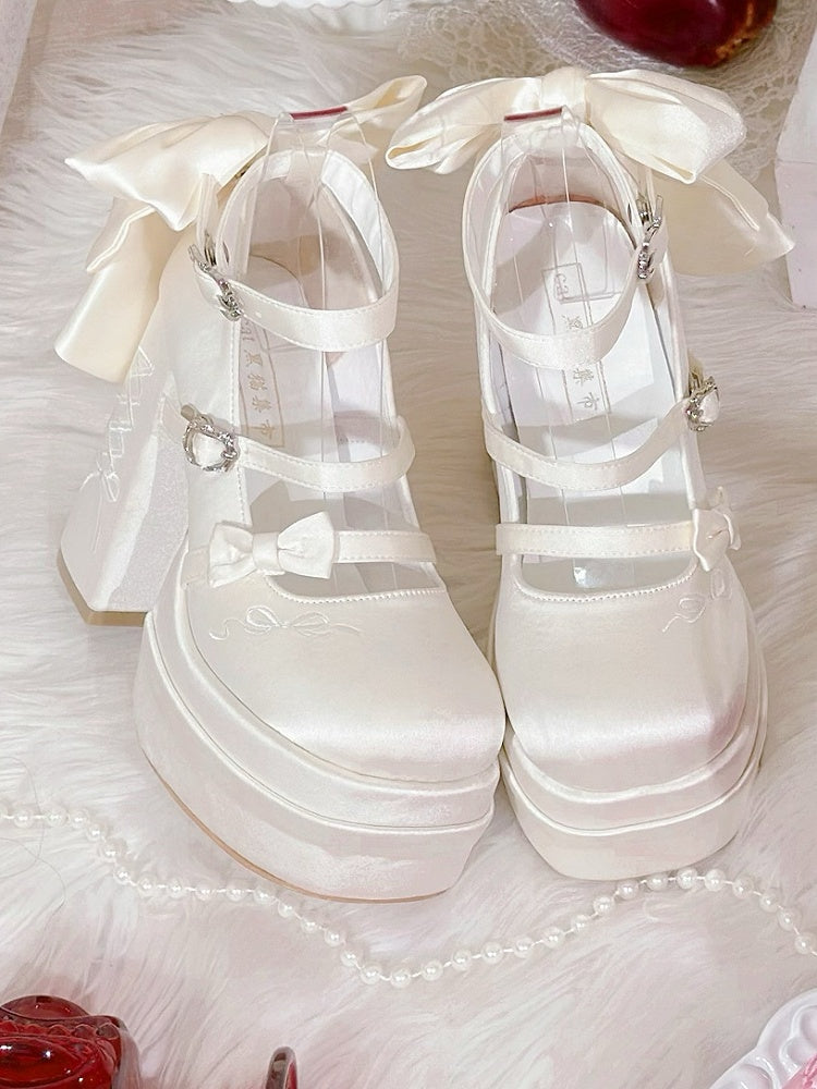 ホワイトの蝶結びエレガントクラシックロリータプラットフォームハイヒールメリージェーン