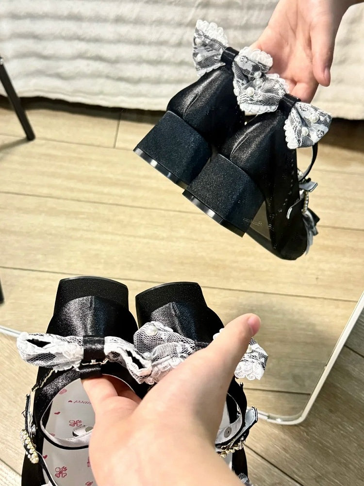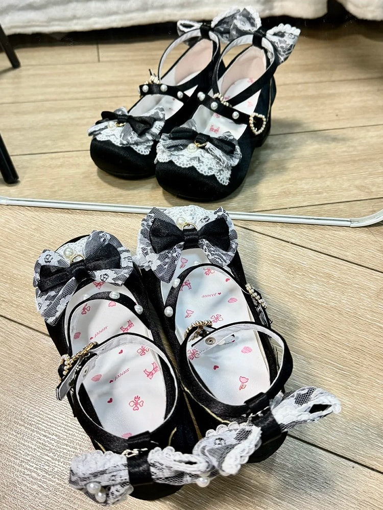 Satin Black Sweet Lolita Mary Janes - Low Heel with Lace Trim & Beaded Heart Snap