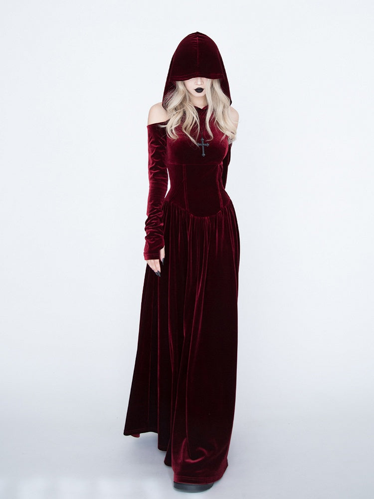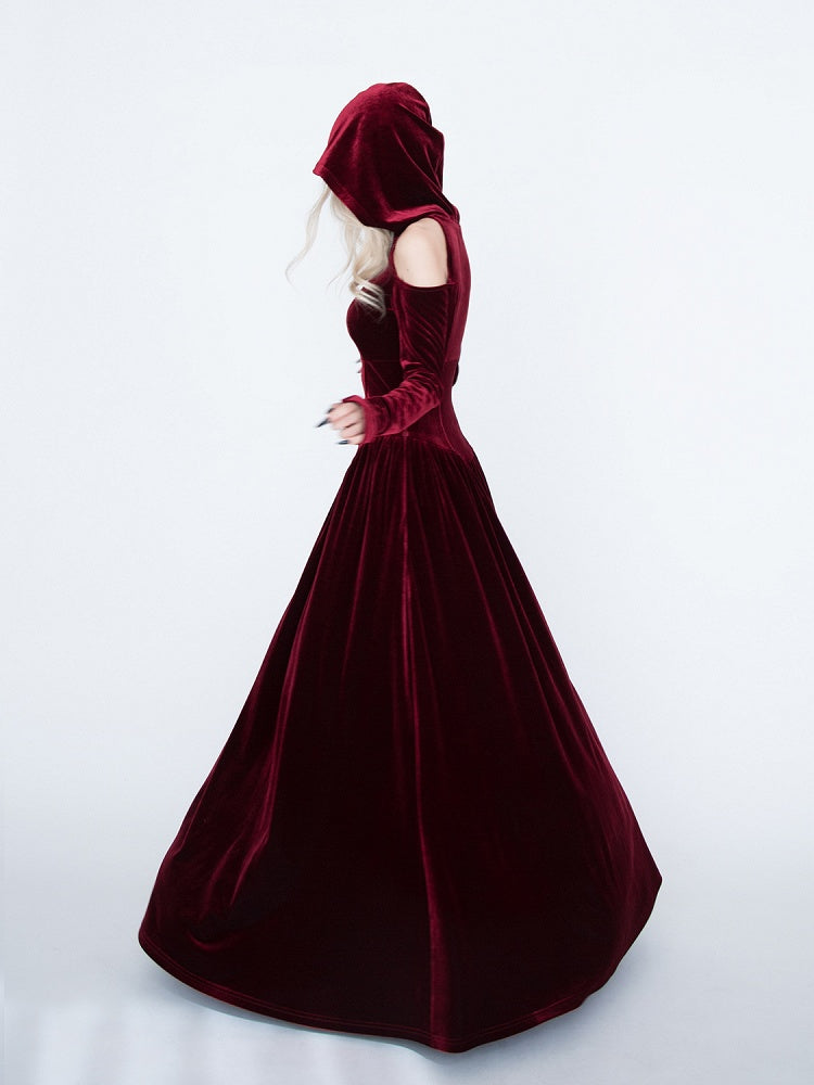 中世の魔女レッドベルベットカットアウトショルダーゴシックヴァンパイアフード付きドレス