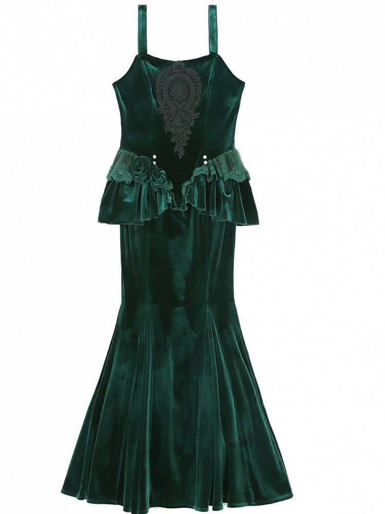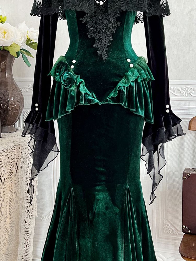 ブラックレースのアップリケとペプラムディテールが施されたダークフォレストグリーンのマーメイドベルベットドレス
