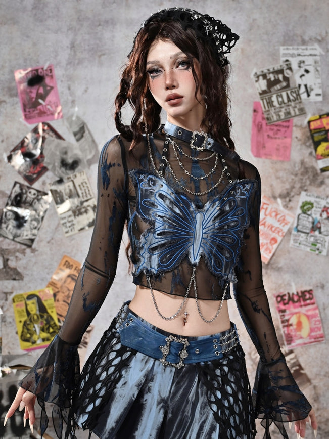 メッシュベルグランジ&フェアリーコアブラックロックパンクブルースリーブトップ