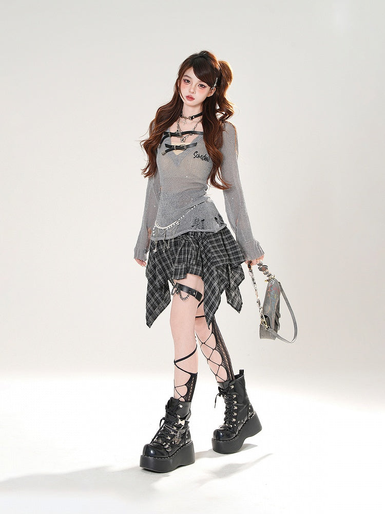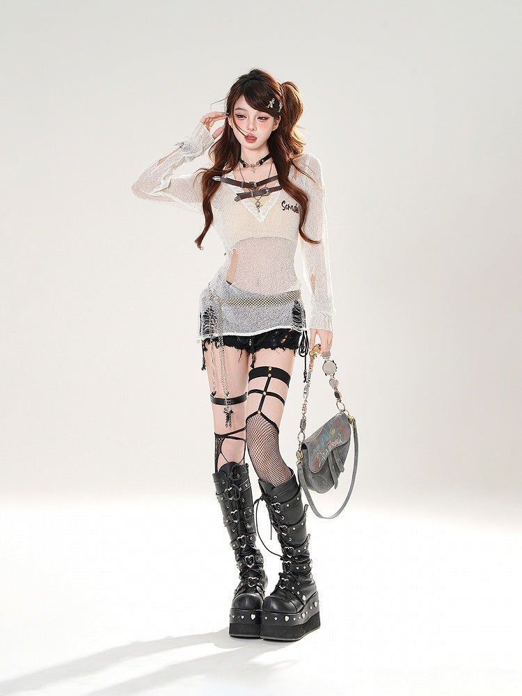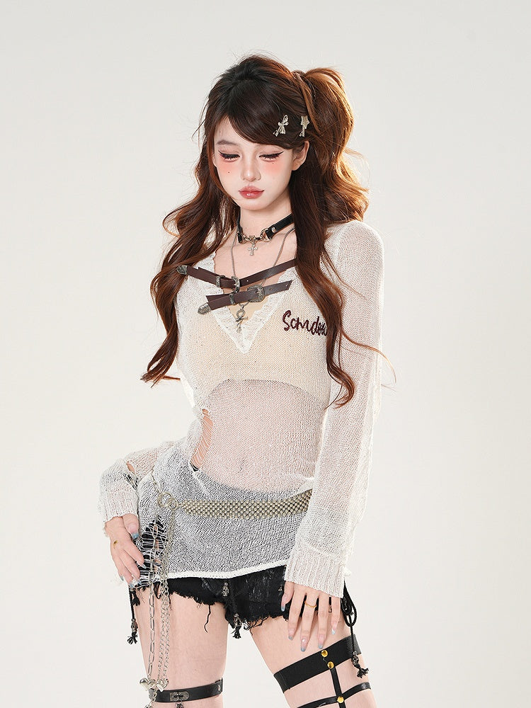 ホワイト/グレーのVネック、バックルストラップ、ダメージ加工の穴あきメッシュ、くり抜きカバーアップ