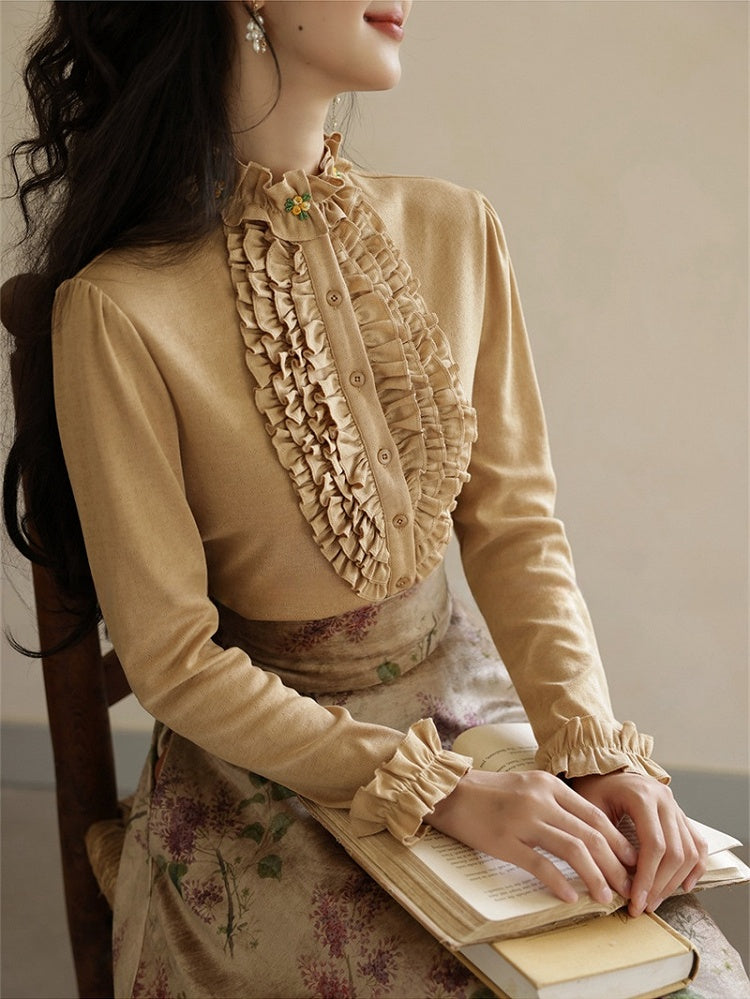ミルクホワイト/カーキのヴィンテージフローラルラッフルトリムブラウスは、どんなワードローブにも合わせやすい魅力的なアイテムです。繊細なラッフルトリムがフェミニンな雰囲気を添え、ヴィンテージフローラル柄が時代を超えた魅力を放ちます。上質な素材を使用し、快適さとスタイルの両方を兼ね備えています。
