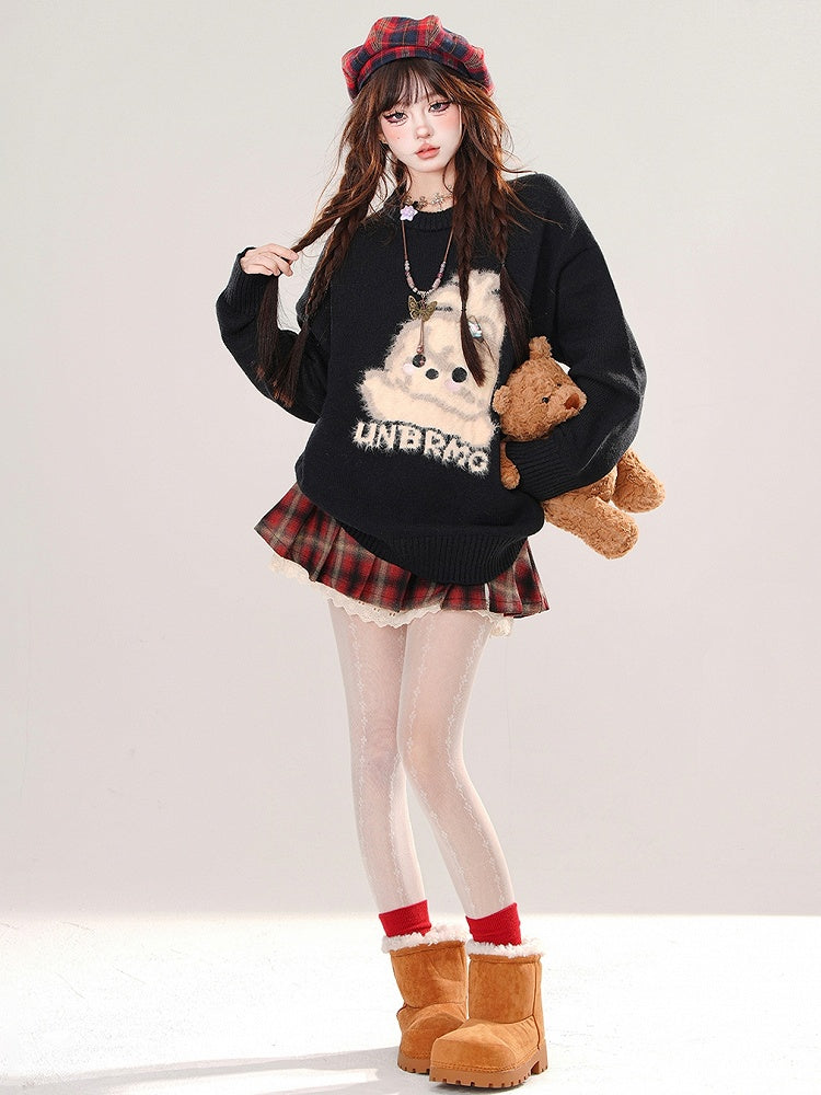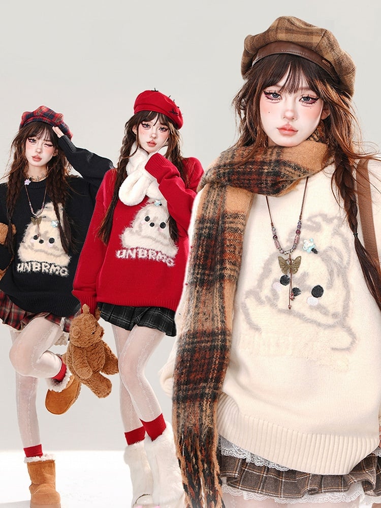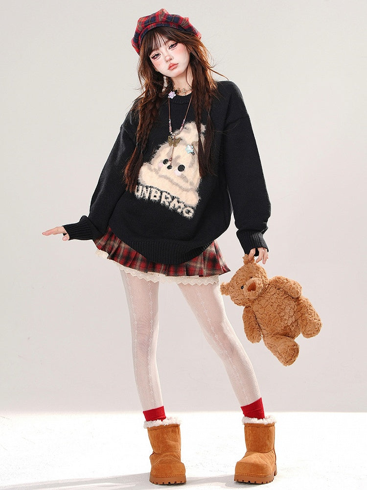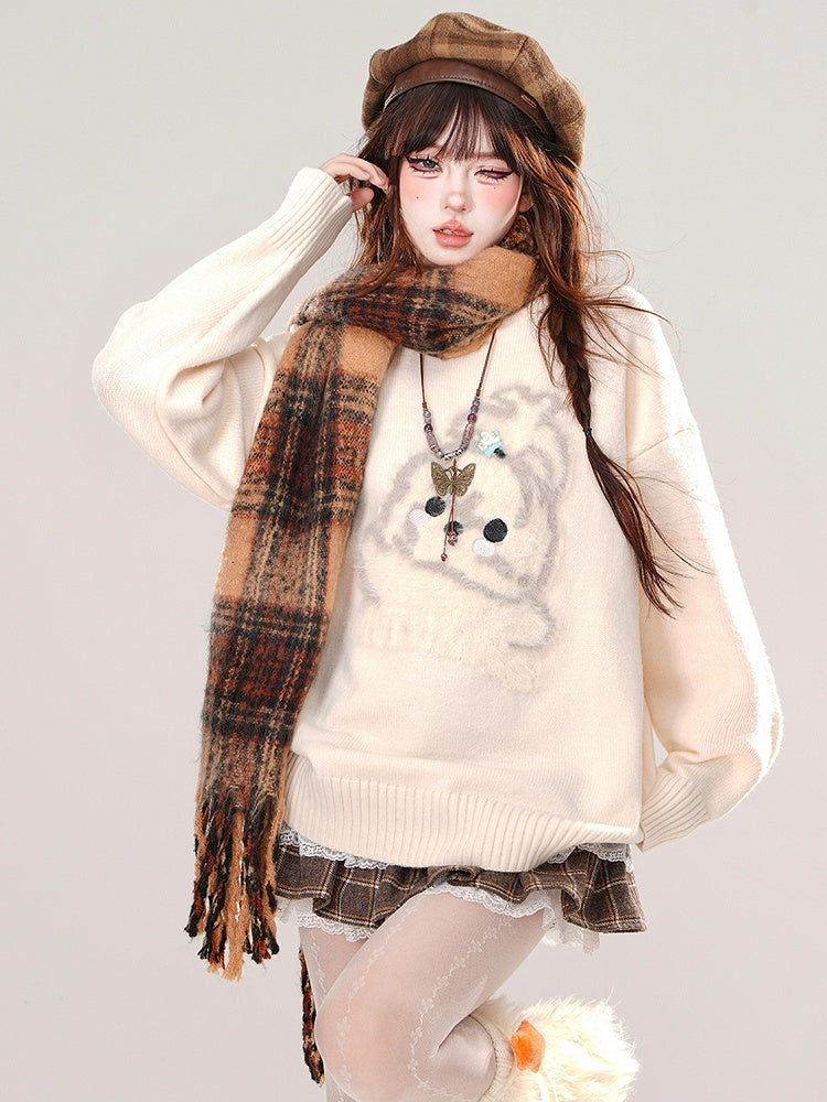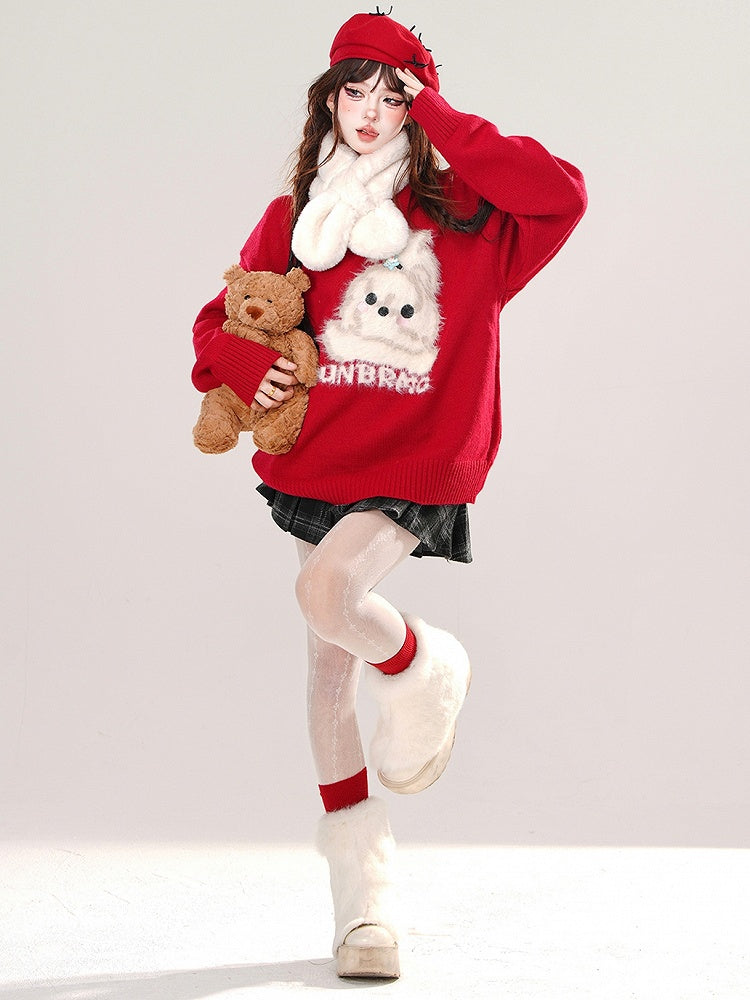 ミルクイエロー/ブラック/レッドのキュートな子犬柄のゆったりセーター