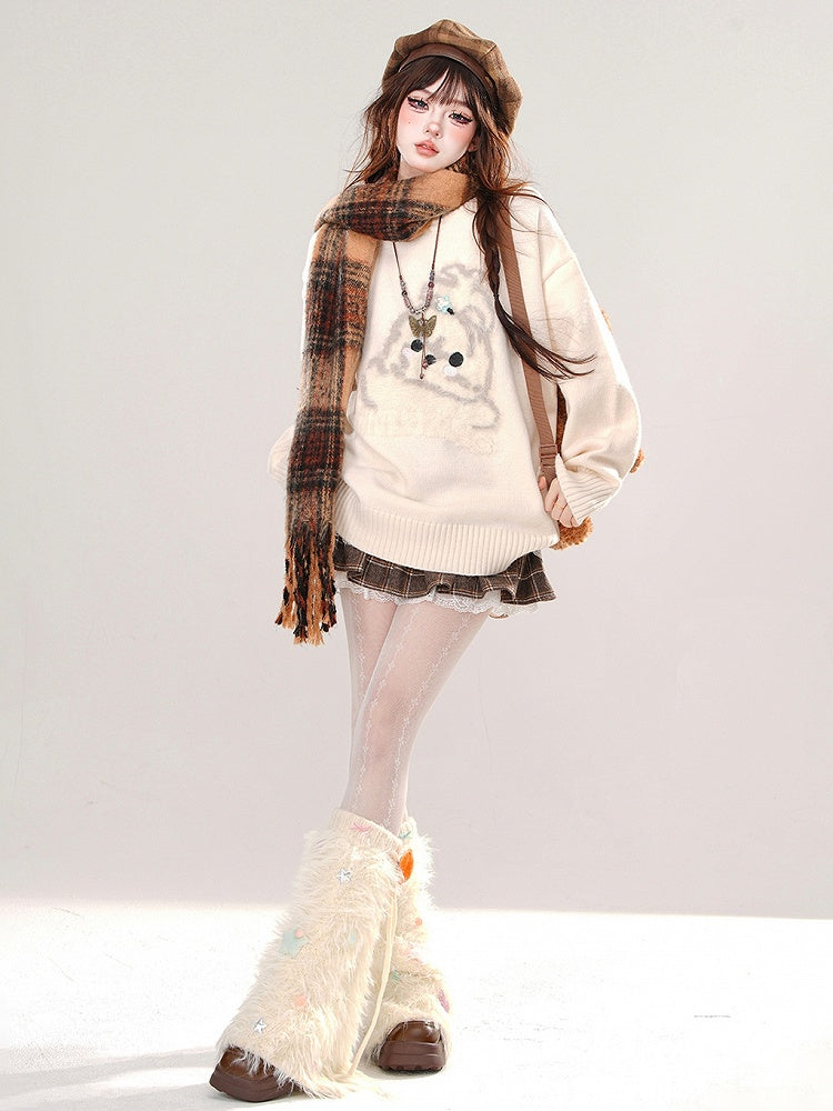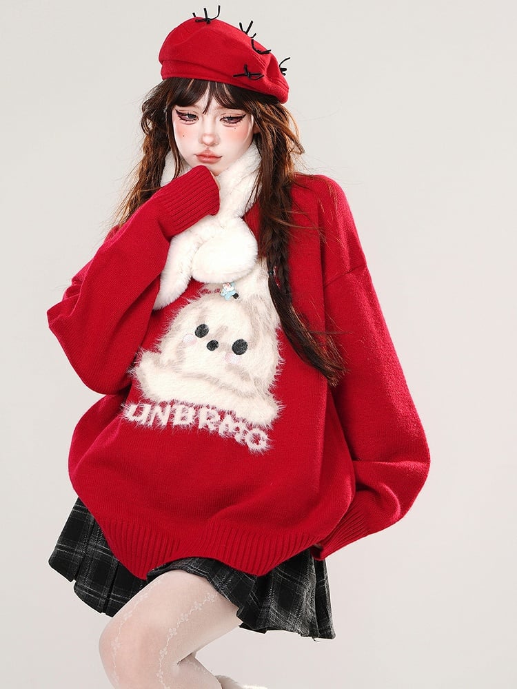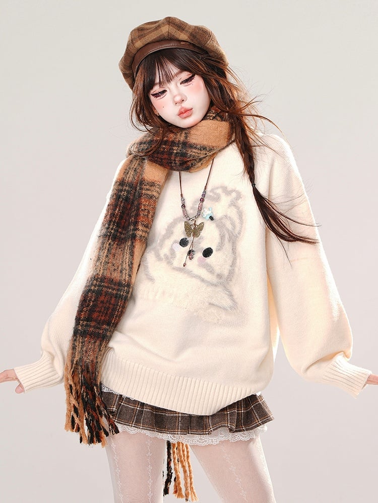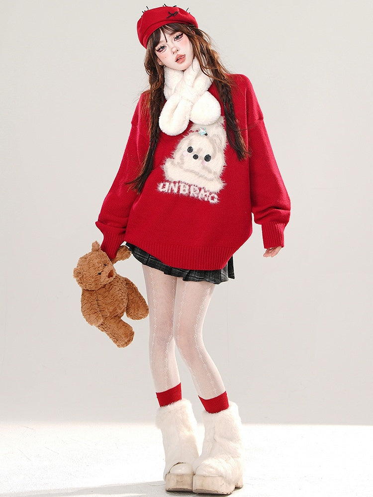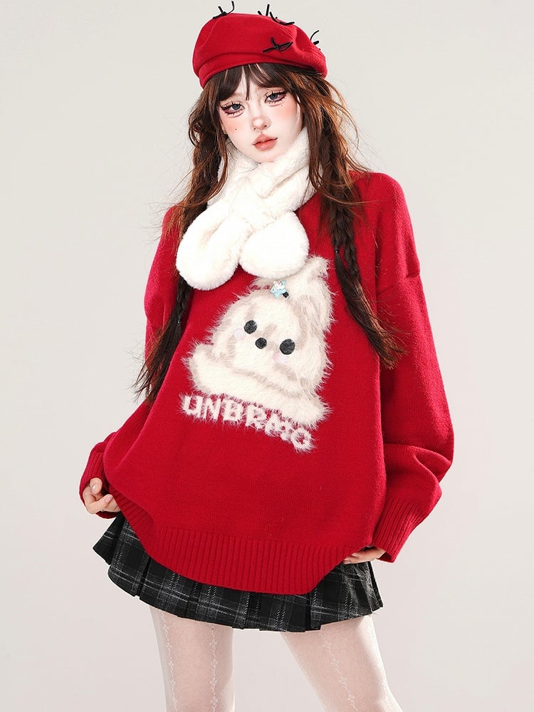 ミルクイエロー/ブラック/レッドのキュートな子犬柄のゆったりセーター