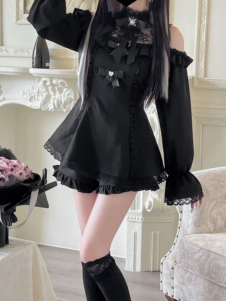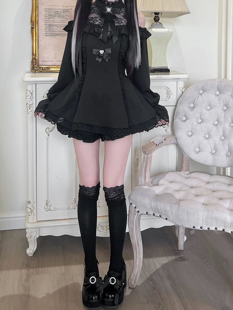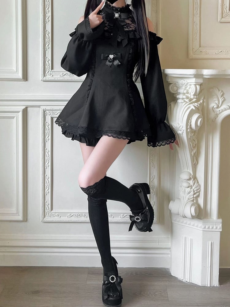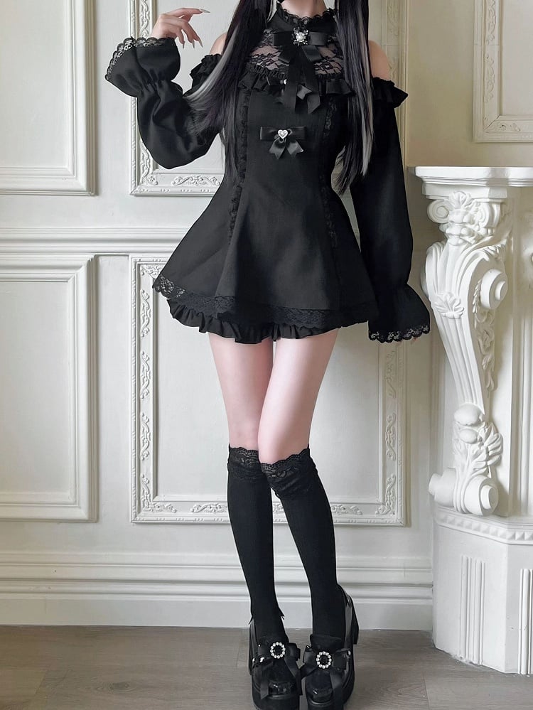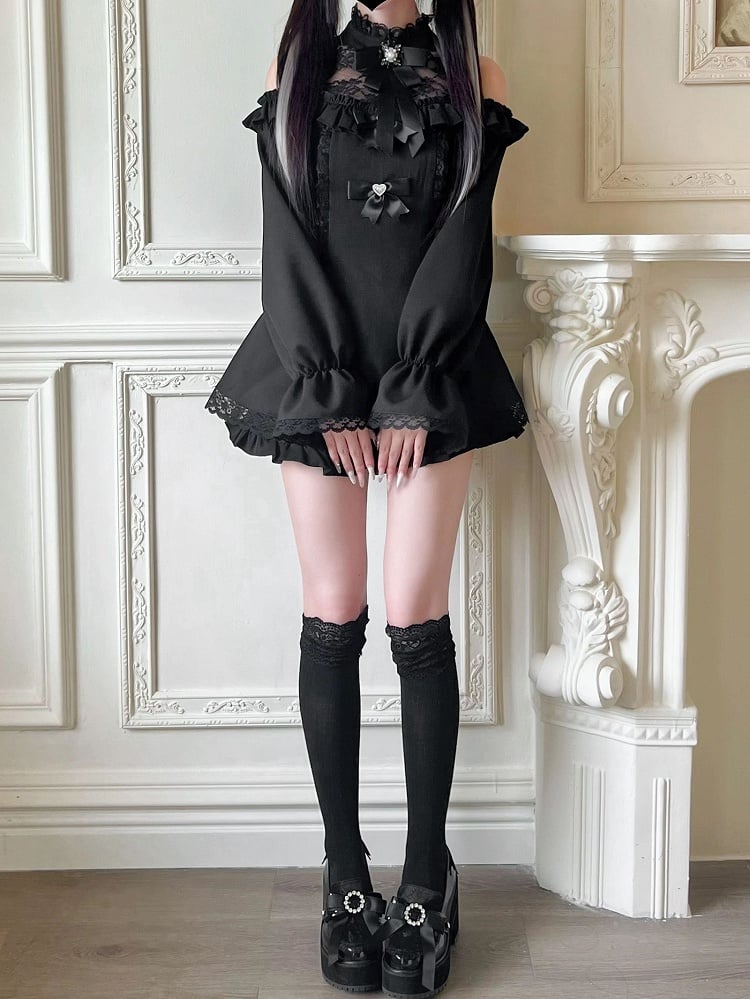 ジライケイイリュージョンフリルショーツ付きミニブラックスカート、カットアウトショルダードレス、ヘムネックラインセット