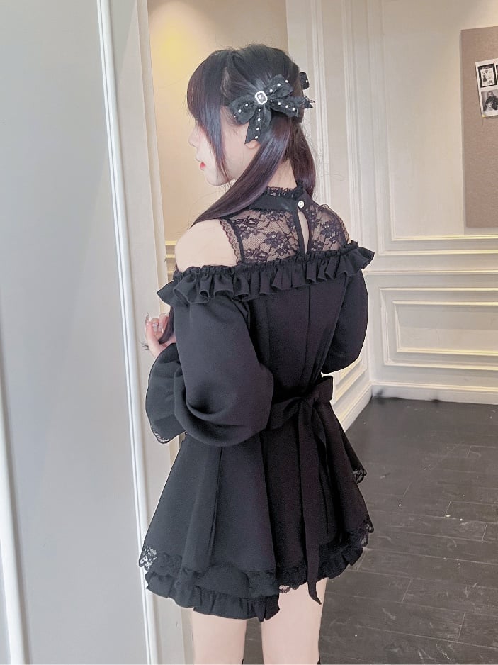● 蝶結びのディテール / コントラストのレースパッチ / カットアウトショルダー / レーストリム / ラッフルトリム