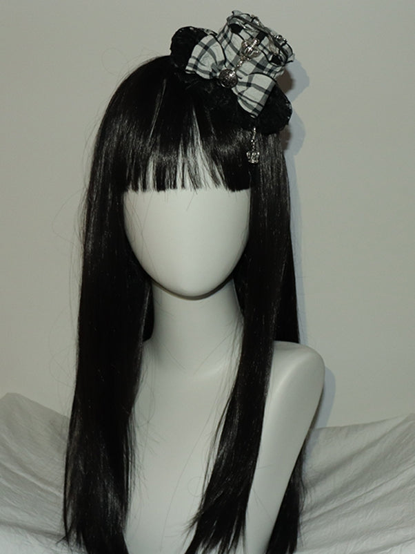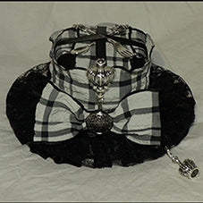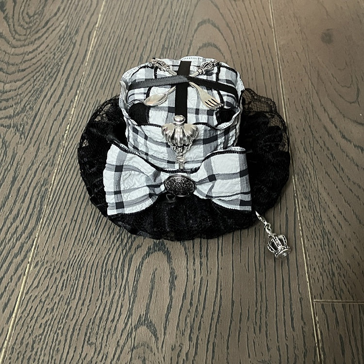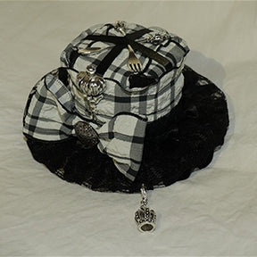 ブラック&ホワイトのクラウンチャーム、蝶結び、フォークとスクープで飾られたチェック柄のミニハット