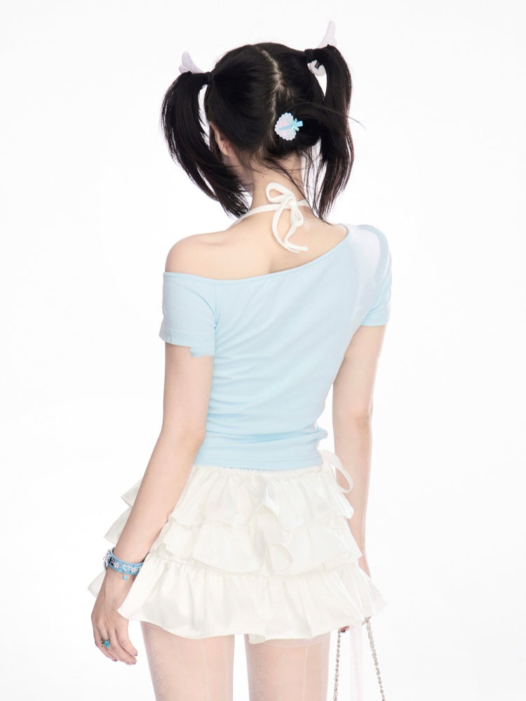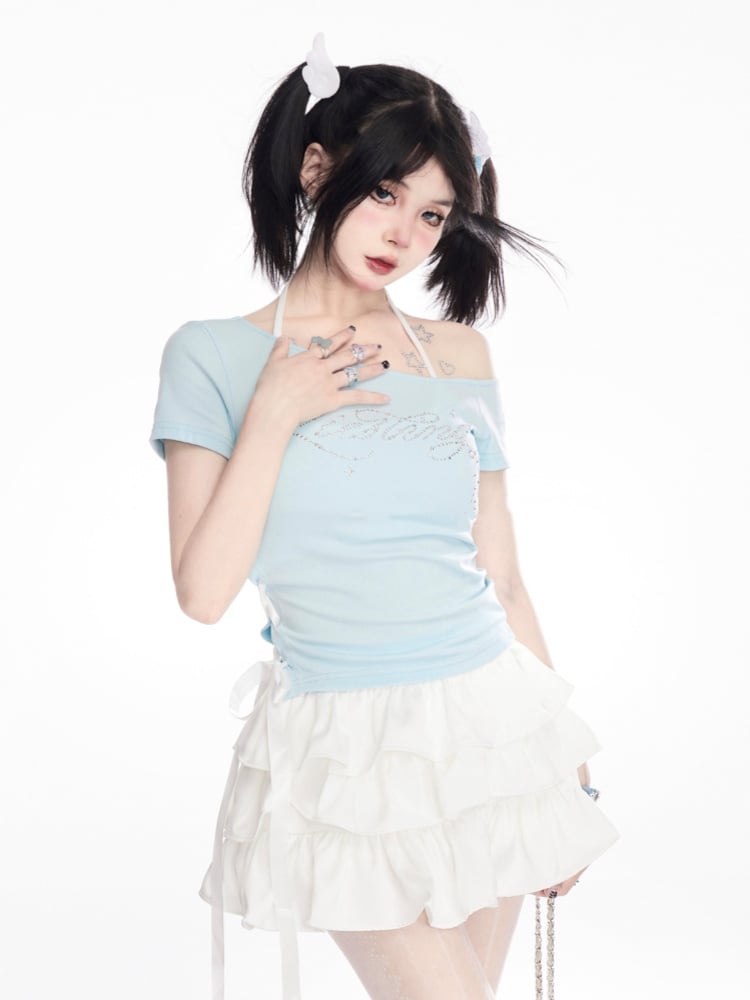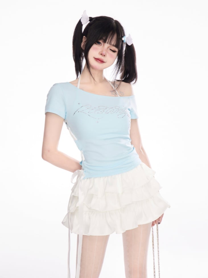 ミントブルー アシンメトリーネックライン レースアップ サイドラインストーン レターTシャツ