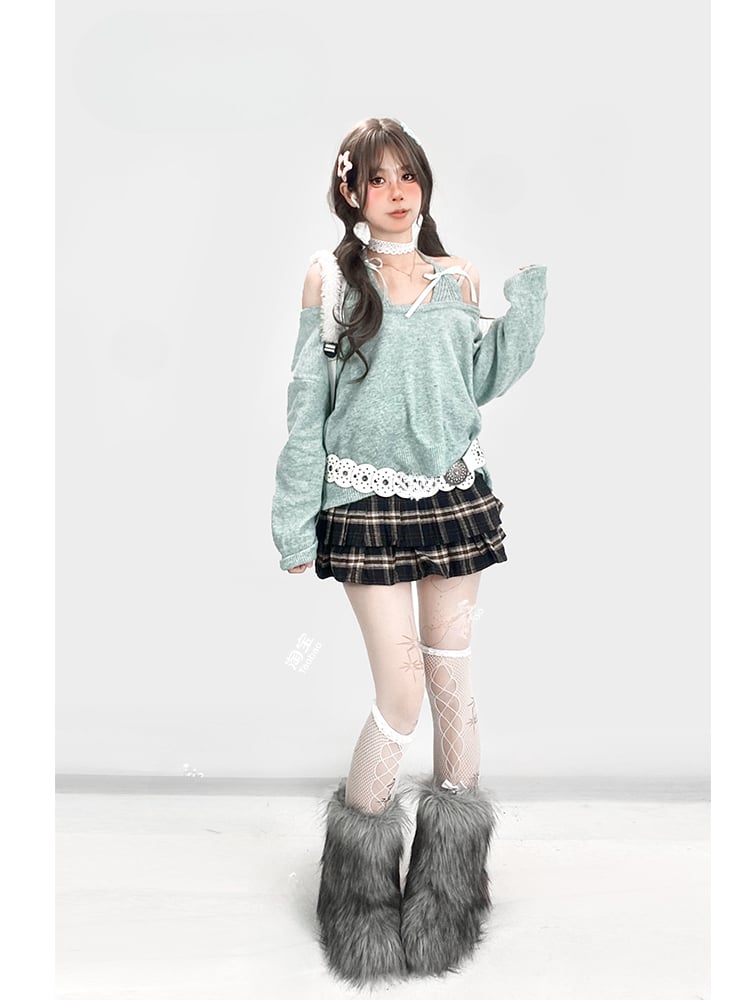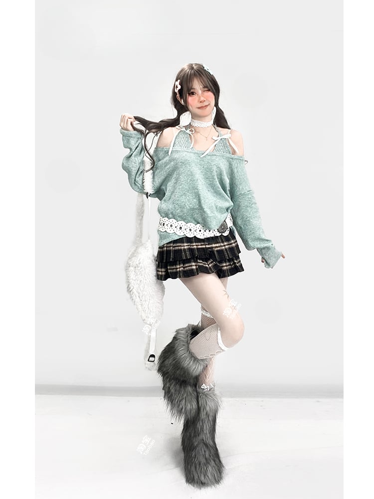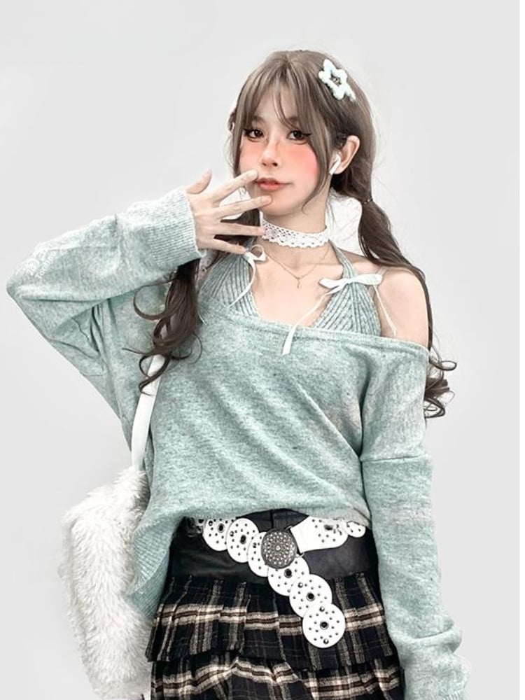 ミントグリーンのホルターネックフェイクツーピースニットセーター