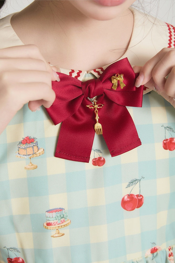 ミントグリーンのギンガムチェックの背景に、チェリーとデザートのプリントが映える、甘美なハイウエストドレス。キュートさとシックさが絶妙に融合したこのドレスは、一日中あなたを素敵で自信に満ちた気分にさせてくれるでしょう。