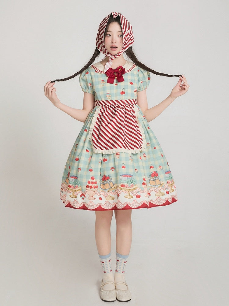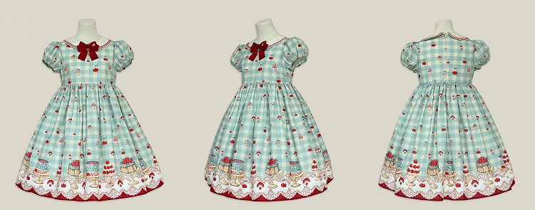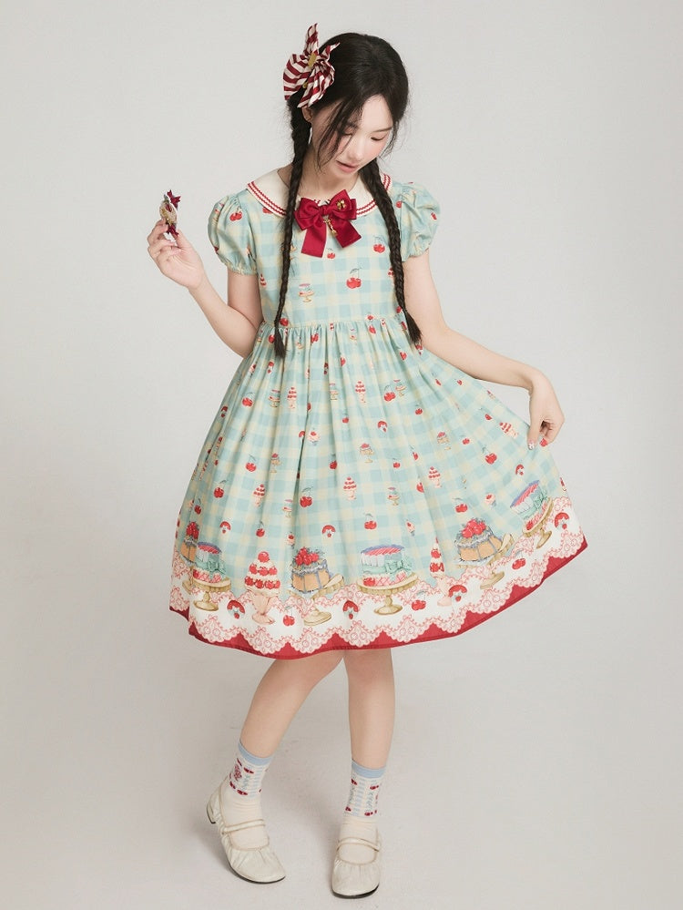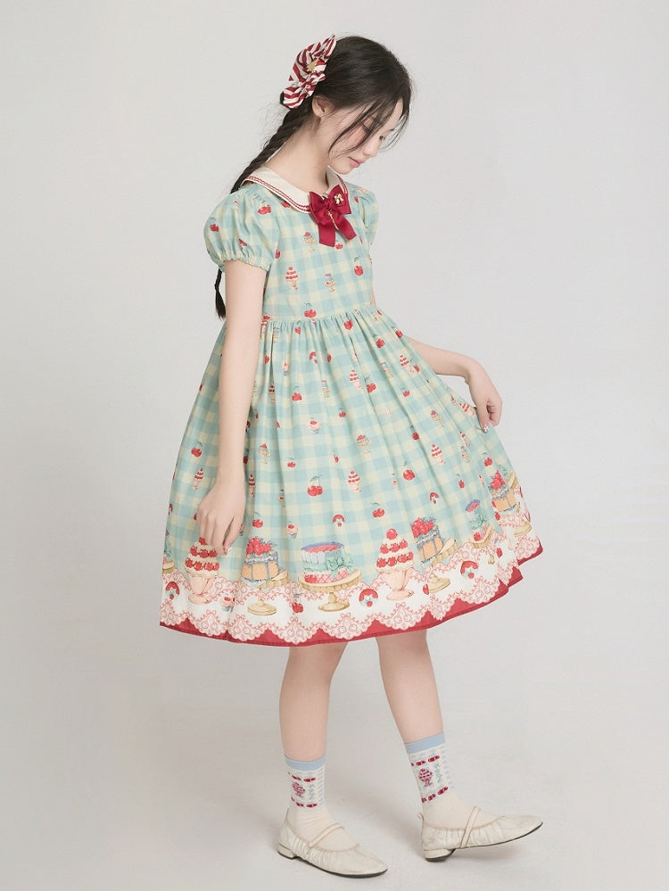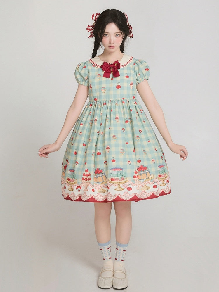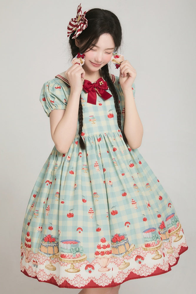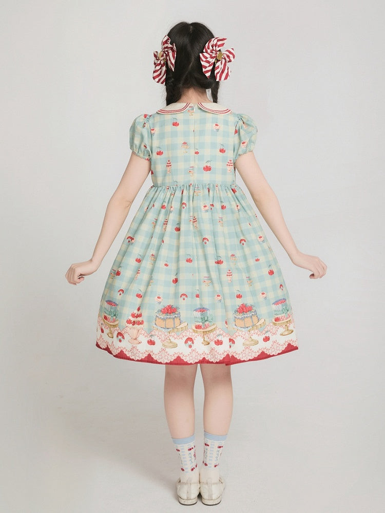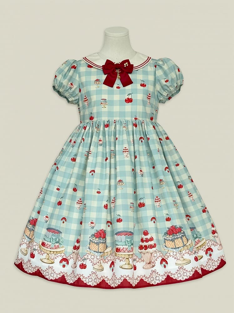 ミントグリーンのハイウエストチェリー&デザートプリントのスイートロリータギンガムドレス