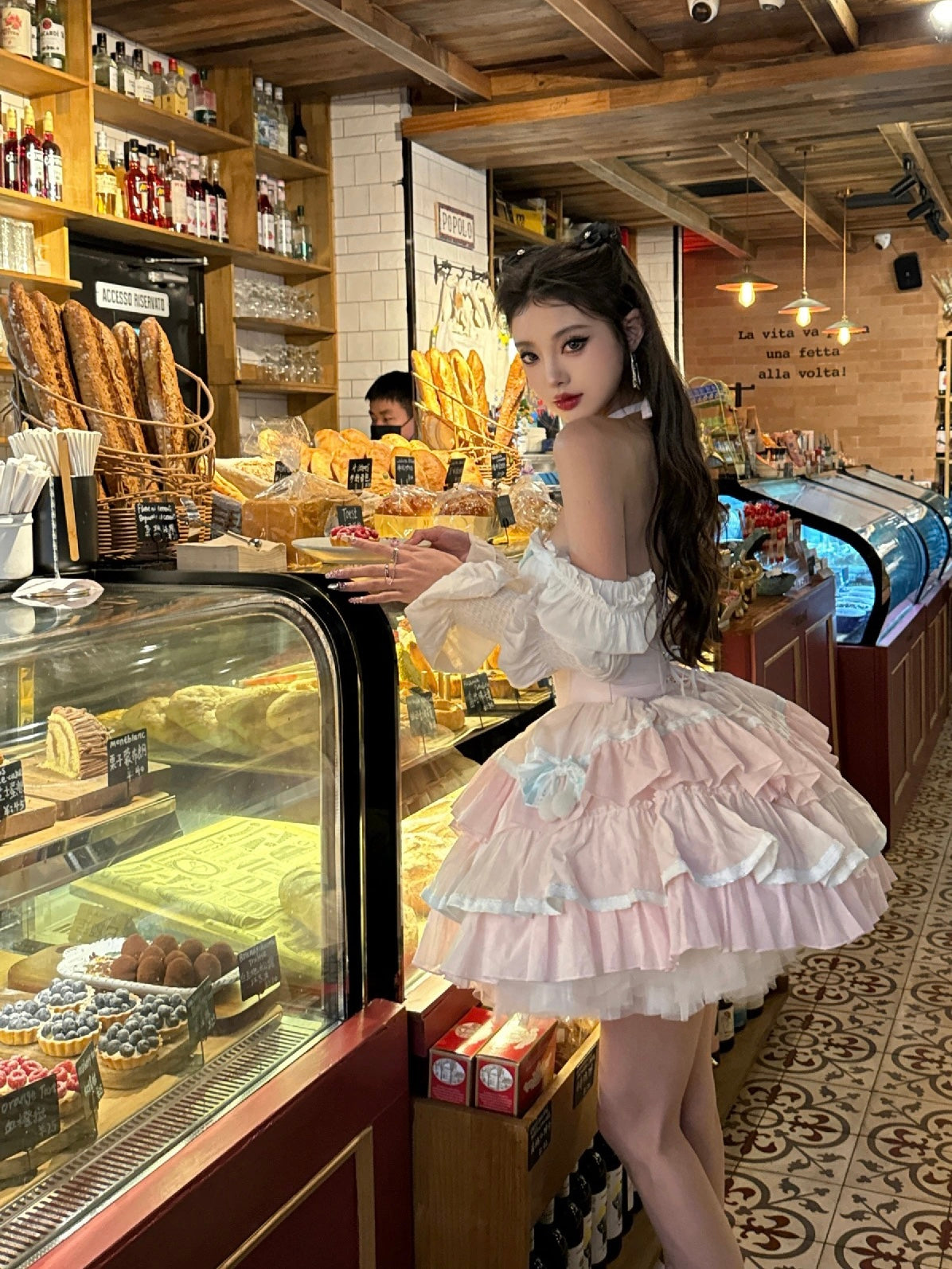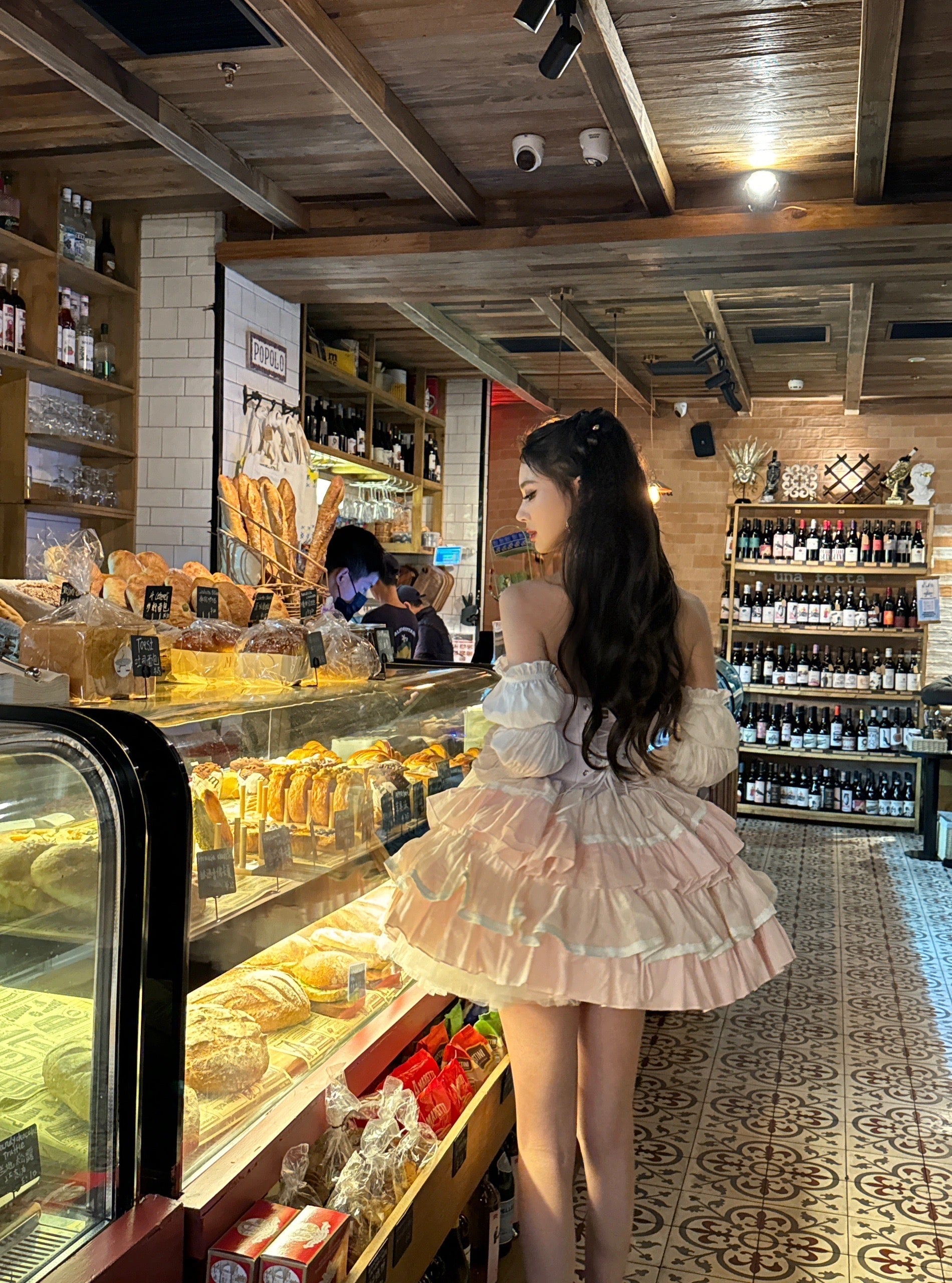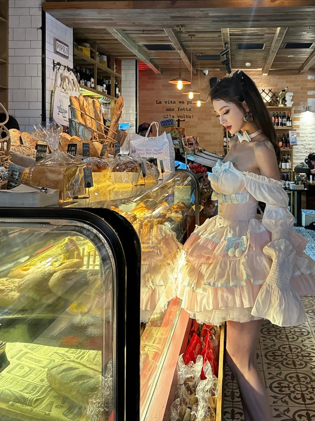 ピンクと白のオールドスクールロリータファッションドレス、蝶結びディテール、ロリータJSKセット