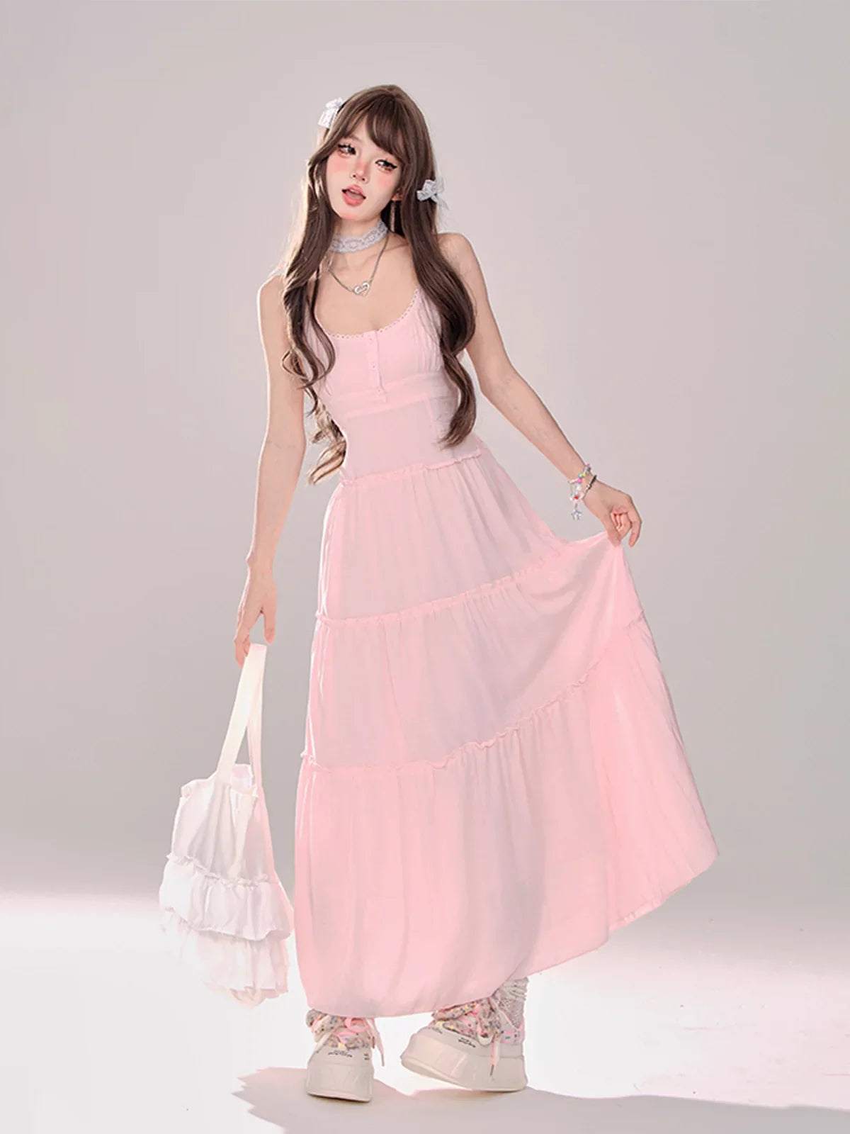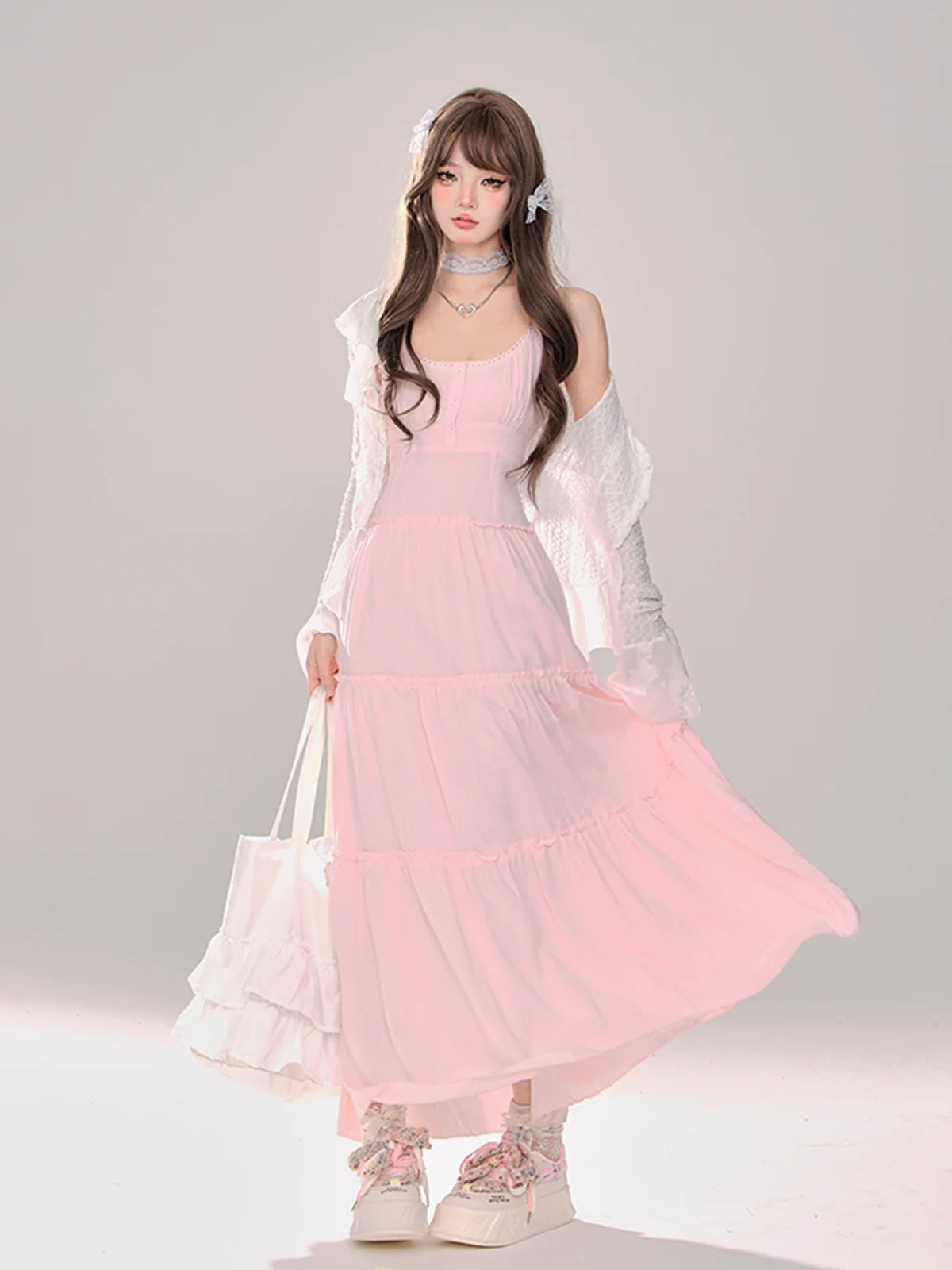 ピンクと白のオールドスクールロリータファッションドレス、蝶結びディテール、ロリータJSKセット