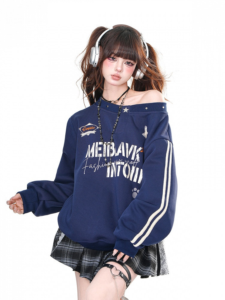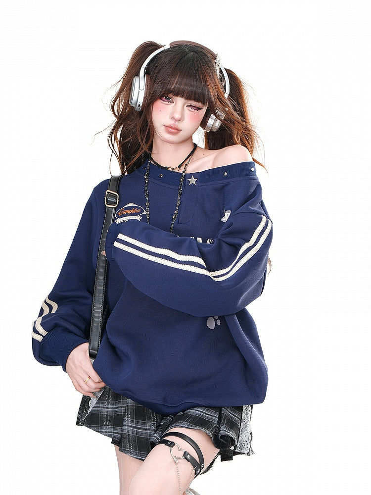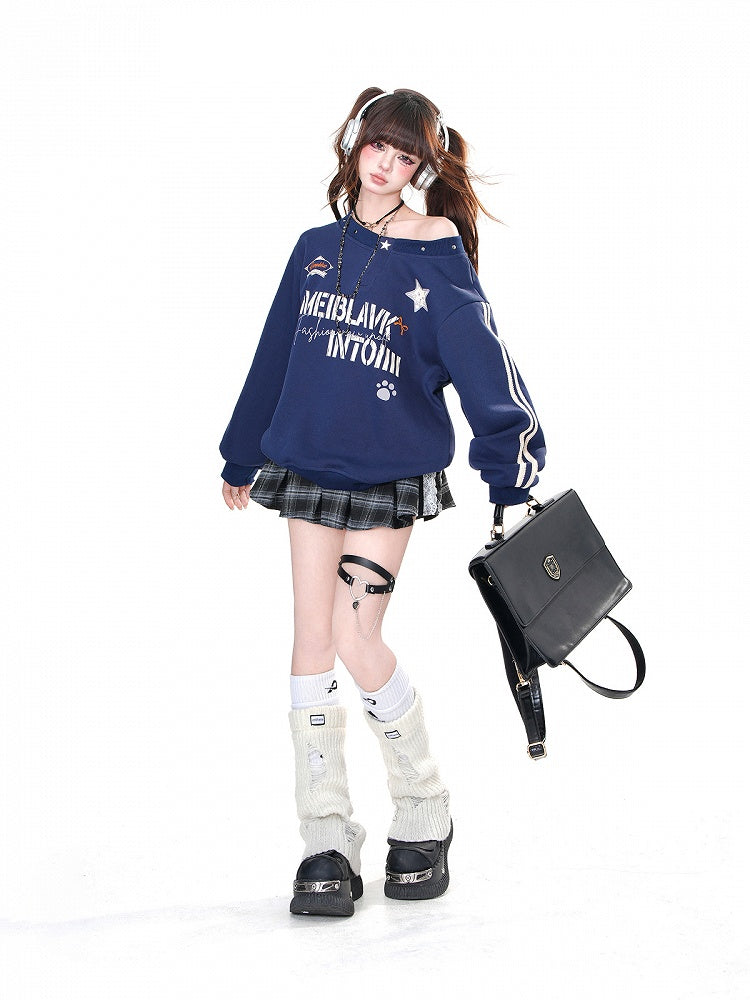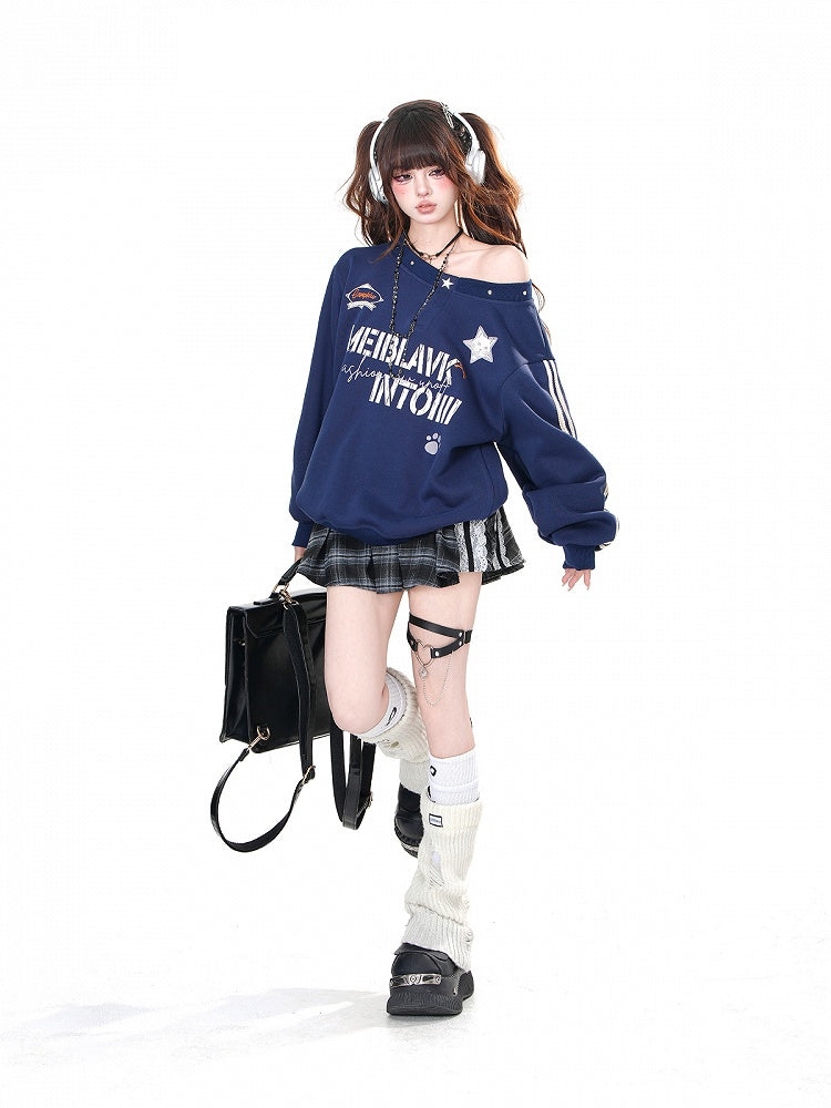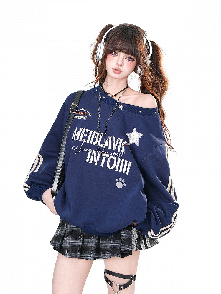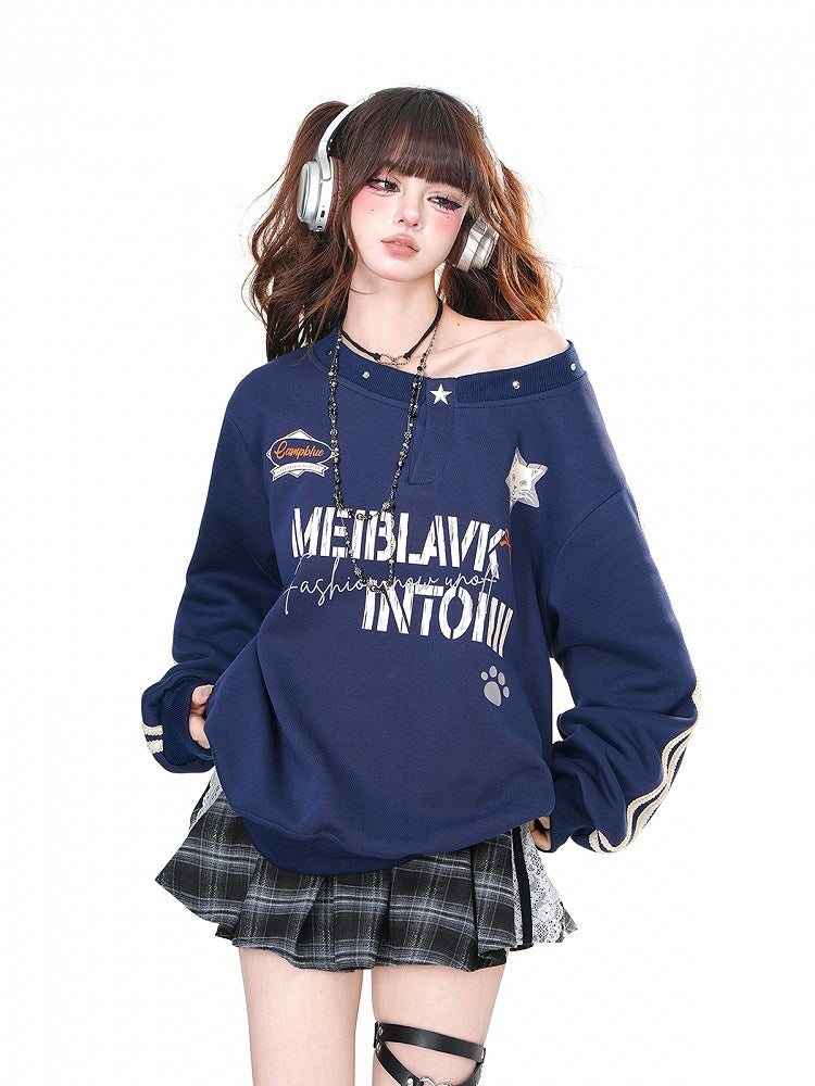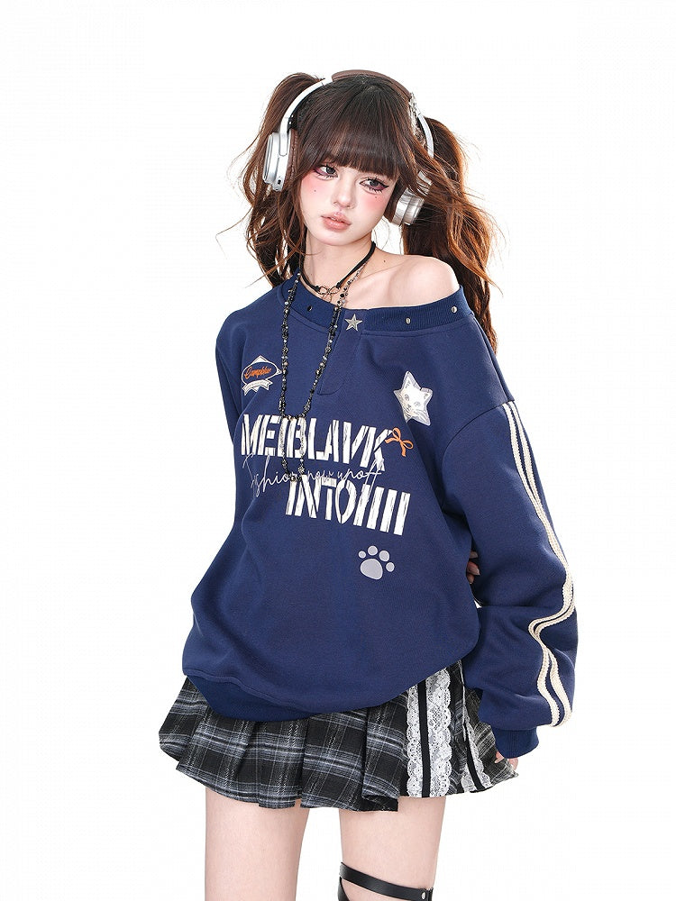 ネイビーブルーのアシンメトリーネックラインのルーズスウェットシャツで、スタイリッシュに快適に過ごしましょう。ユニークなデザインがキュートな印象を添え、快適な着心地もキープ。どんなシーンにもぴったりのこのスウェットシャツは、カジュアルでありながらファッショナブルなルックを叶える頼れる一枚となるでしょう。