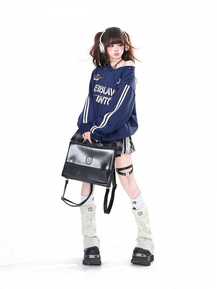 ネイビーブルーのアシンメトリーネックラインのルーズスウェットシャツ