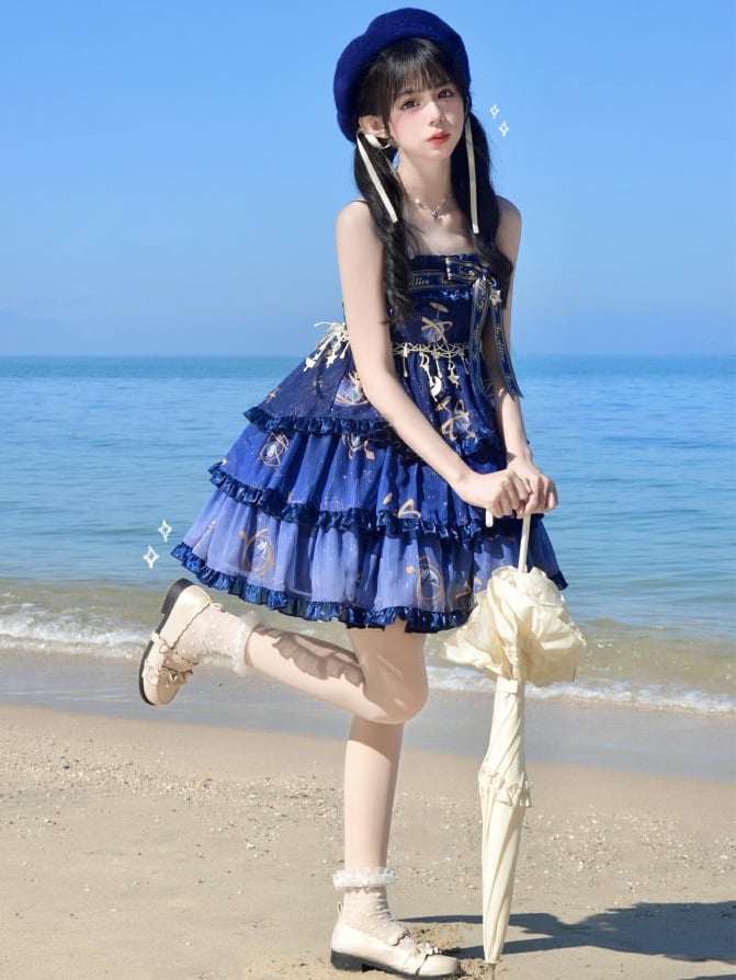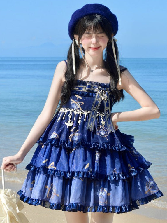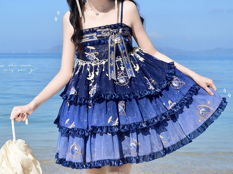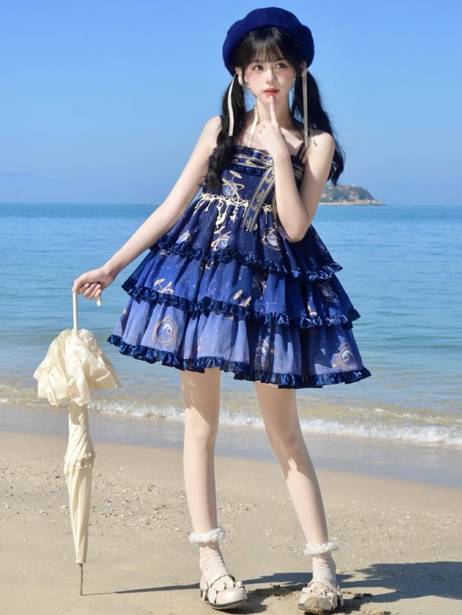 ネイビーブルーの天球儀と星空をあしらったエンパイアウエストのロリータジャンパースカートで、世界を旅して星空を探検する準備をしましょう。チャーミングなデザインと快適なフィット感で、着るたびにキュートな地球を旅する気分にさせてくれます。