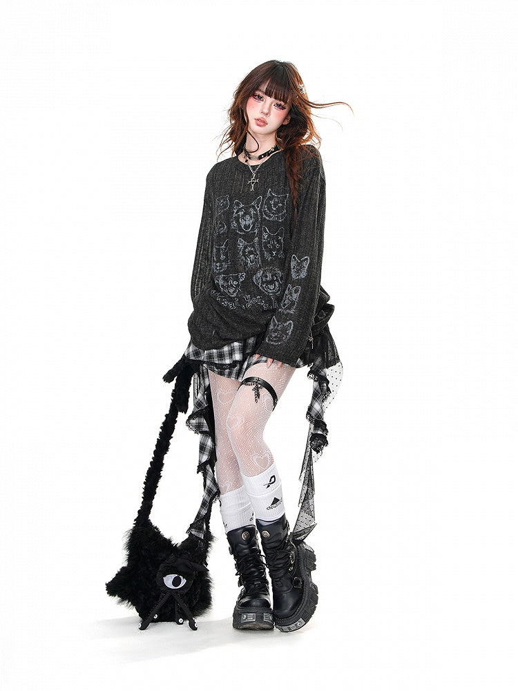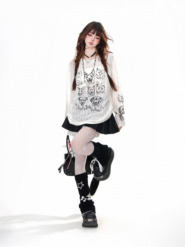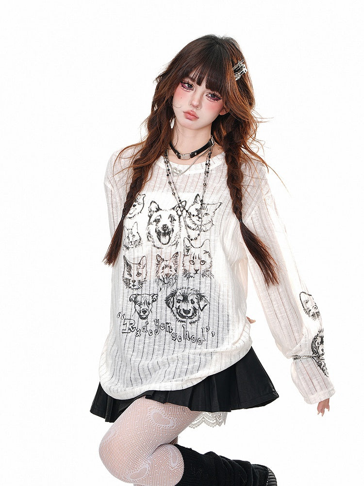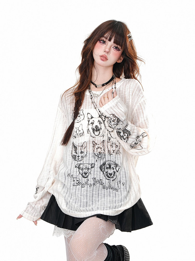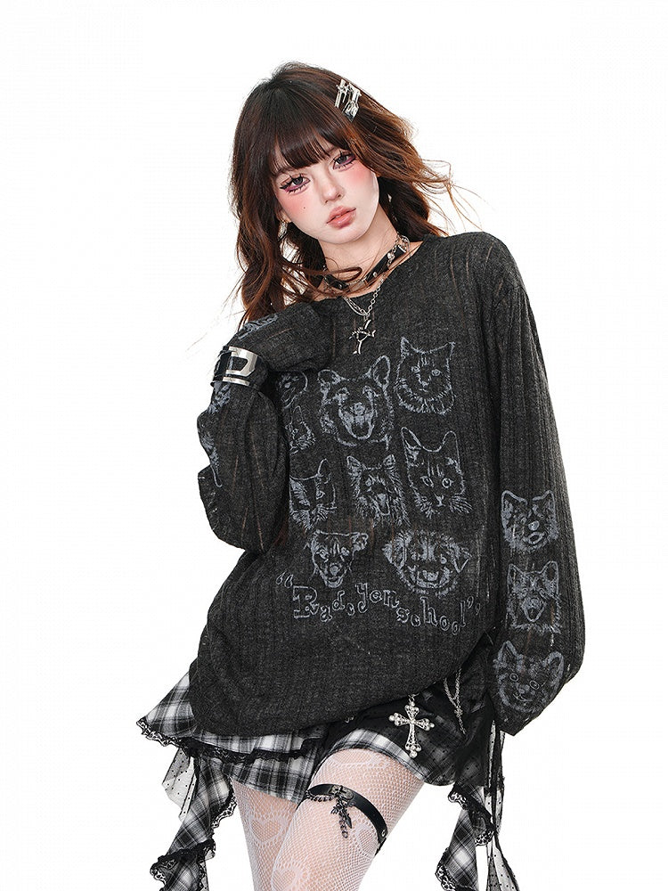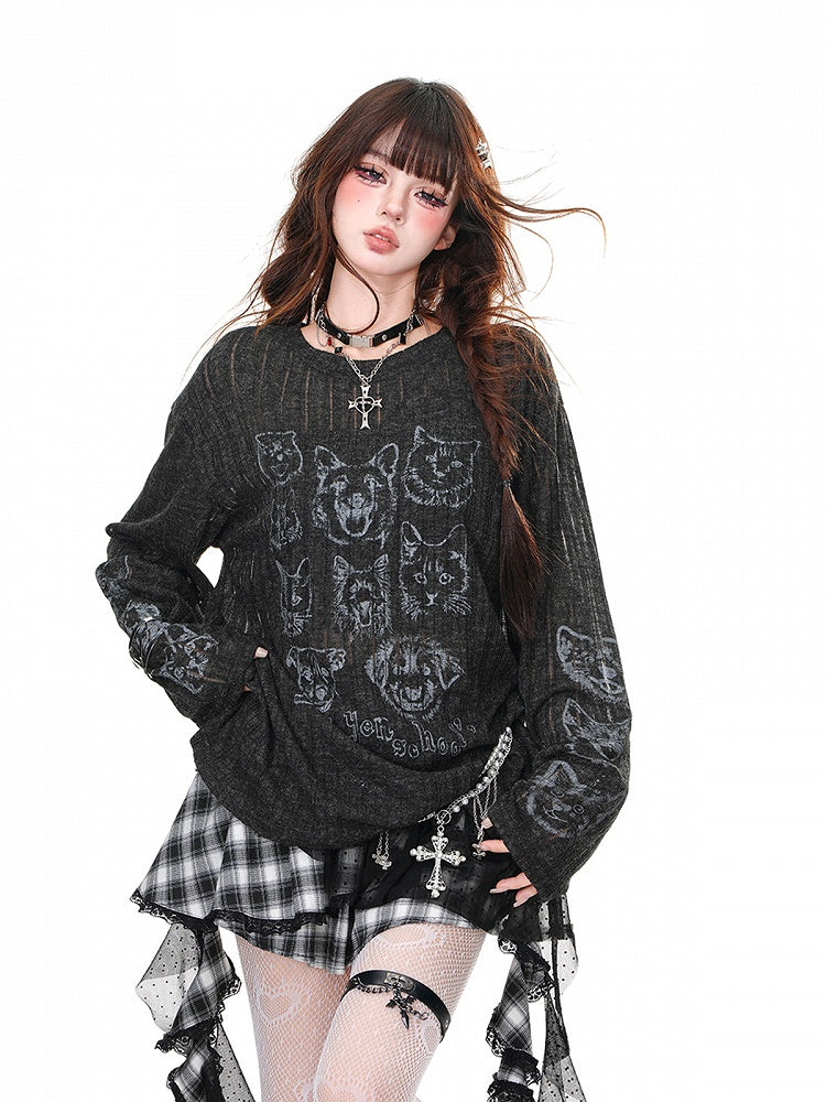 ブラック/ベージュのセミシアーラウンドネックの子犬と子猫のプリントのルーズトップ