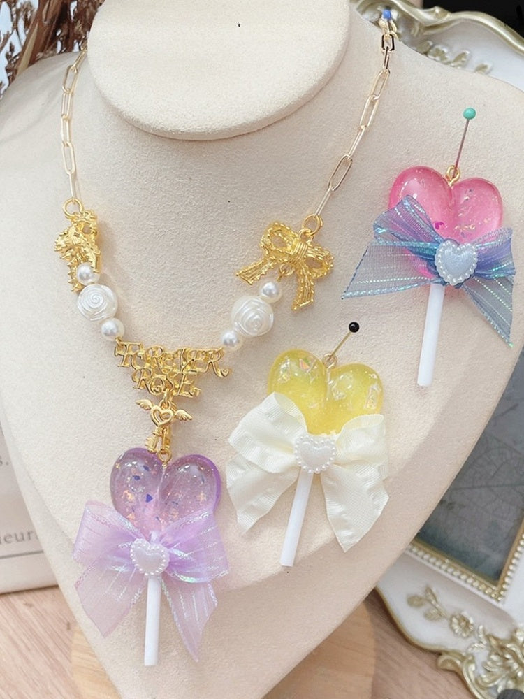 ネックレス 蝶結び 装飾ペンダント イエロー/ピンク/パープル ロリポップ ビーズ