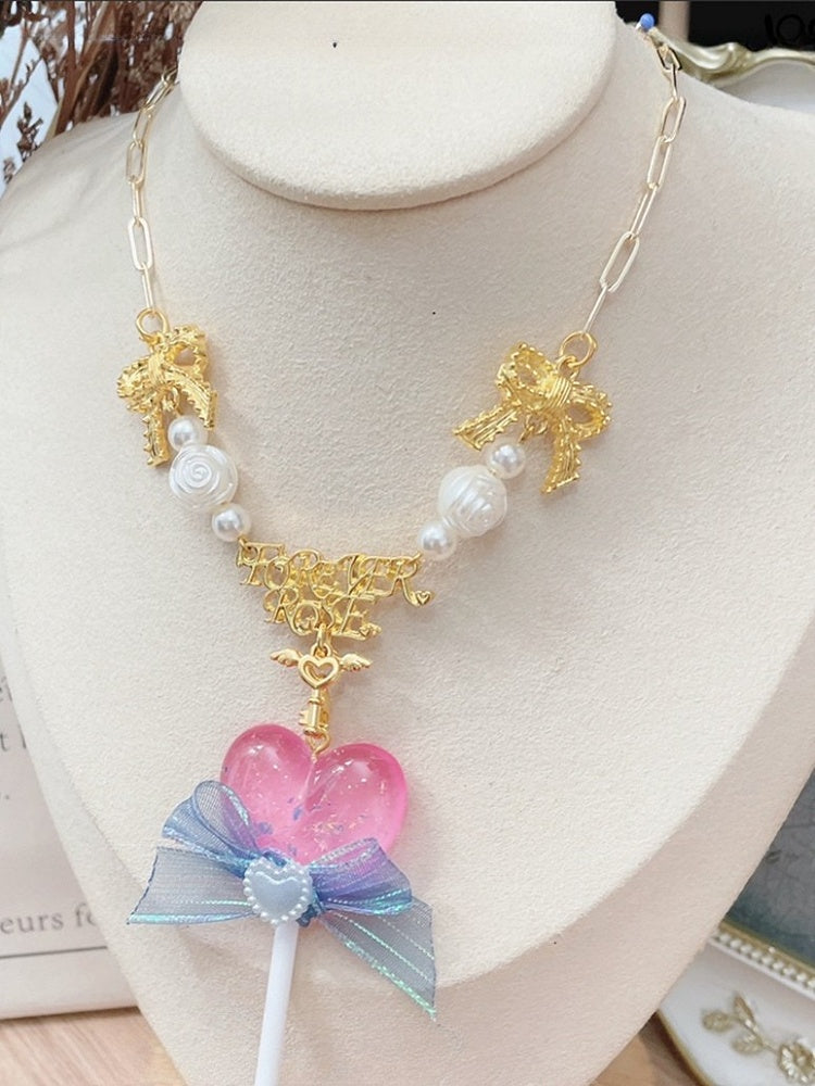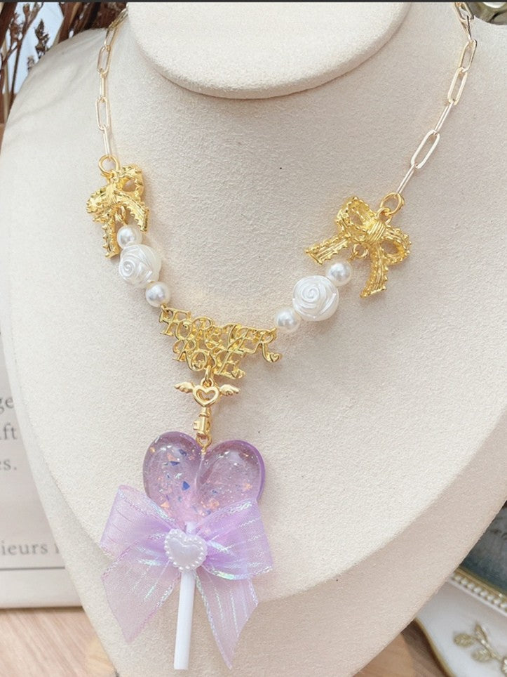 イエロー/ピンク/パープルのビーズと蝶結びで飾られたロリポップペンダントネックレス