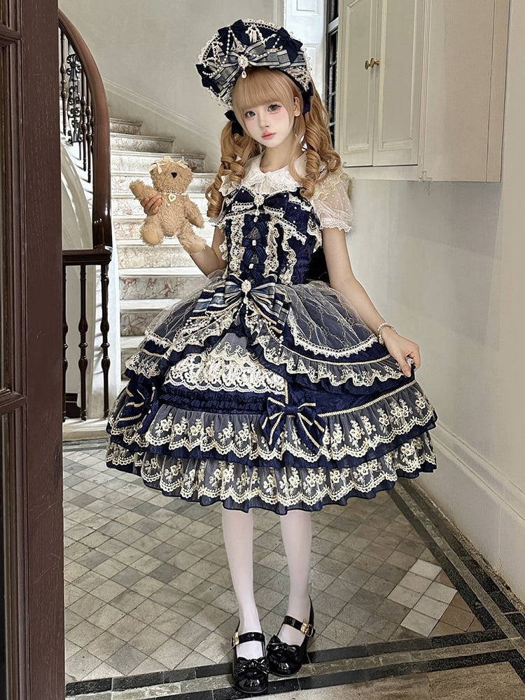Dark Blue Bead Chain Bow Neckline Gorgeous Princess Lolita Dress