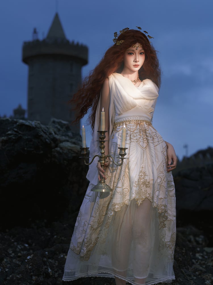ネックライン ギリシャ風 スカート カウル ゴールド ジャンパー 天体地図 刺繍 ホワイト
